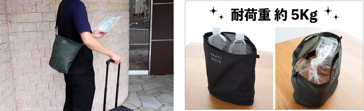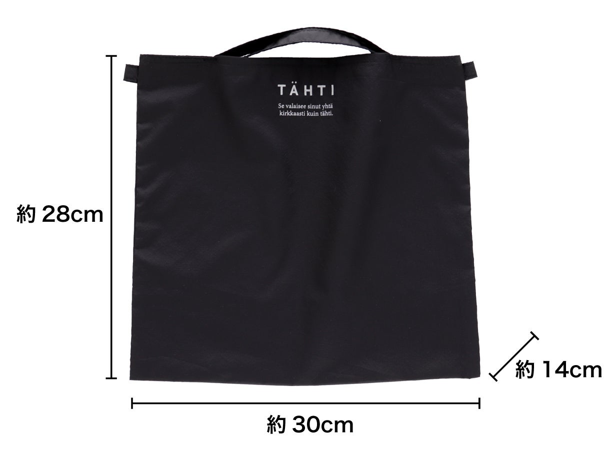 ポーチと同様、薄くて軽いナイロン素材を使用。耐荷重が約5kgに対し、重さは約19gと軽量。畳むと手のひらサイズに小さくまとまります。持ち歩くのにかさばらず、急に荷物が増えた時に便利なアイテムです。お出かけ時も上着やお土産をサッと収納できます。