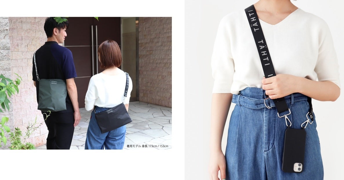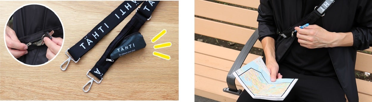 「付属のポーチやエコバッグをスマートに収納したい」「ポケットのない服でも、鍵やペンをすぐに取り出せるようにしたい」「今まで見たことがないような商品にしたい」…そんな思いから、ストラップの一部に収納機能をつけました。ポケット部分は着用時に外から見えないよう工夫を重ね、細部にまでこだわった商品です。
