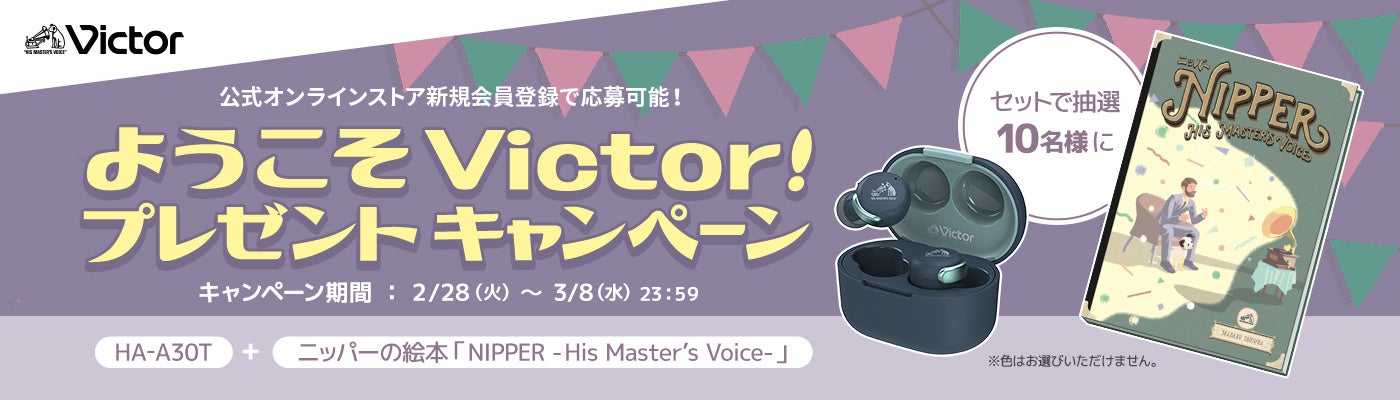 期間中、公式オンラインストア「JVCケンウッドストア」に登録していただいたお客さまの中から、抽選で10名様にVictorの完全ワイヤレスイヤホン「HA-A30T」と、ビクターブランドの象徴である犬のニッパーの物語を描いた絵本「NIPPER –His Master’s Voice-」をセットでプレゼントします。また、公式オンラインストアの新規会員特典として、初めてご登録された方には、製品購入後に使える500ポイントが付与されます。