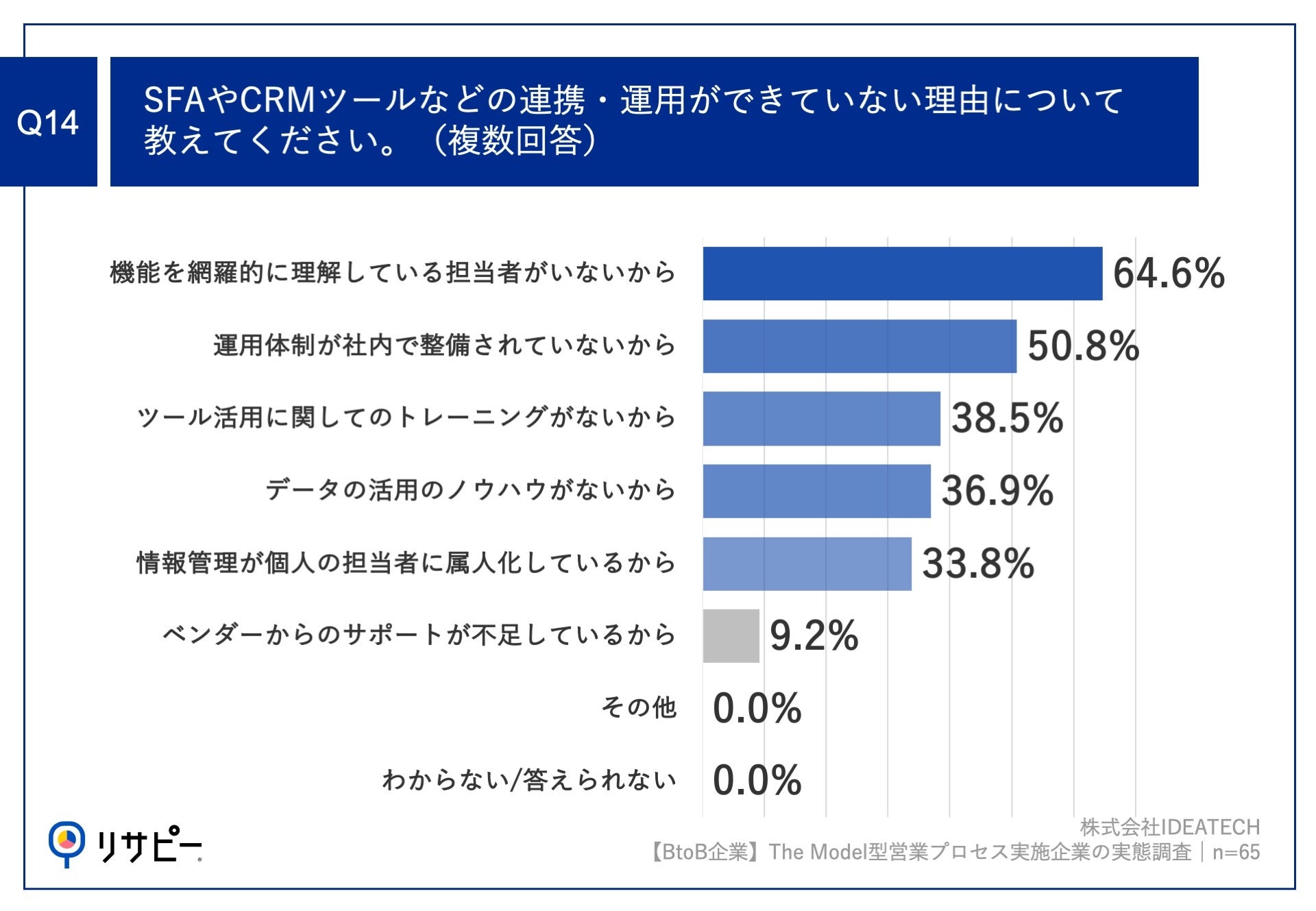 Q11で「SFAやCRMツールなどの連携・運用ができていないから」と回答した方に、「Q14.SFAやCRMツールなどの連携・運用ができていない理由について教えてください。(複数回答)」(n=65)と質問したところ、「機能を網羅的に理解している担当者がいないから」が64.6%、「運用体制が社内で整備されていないから」が50.8%、「ツール活用に関してのトレーニングがないから」が38.5%という回答となりました。
