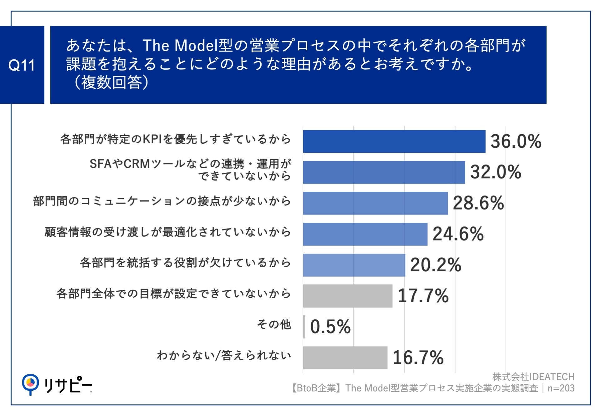 「Q11.あなたは、The Model型の営業プロセスの中でそれぞれの各部門が課題を抱えることにどのような理由があるとお考えですか。(複数回答)」(n=203)と質問したところ、「各部門が特定のKPIを優先しすぎているから」が36.0%、「SFAやCRMツールなどの連携・運用ができていないから」が32.0%、「部門間のコミュニケーションの接点が少ないから」が28.6%という回答となりました。