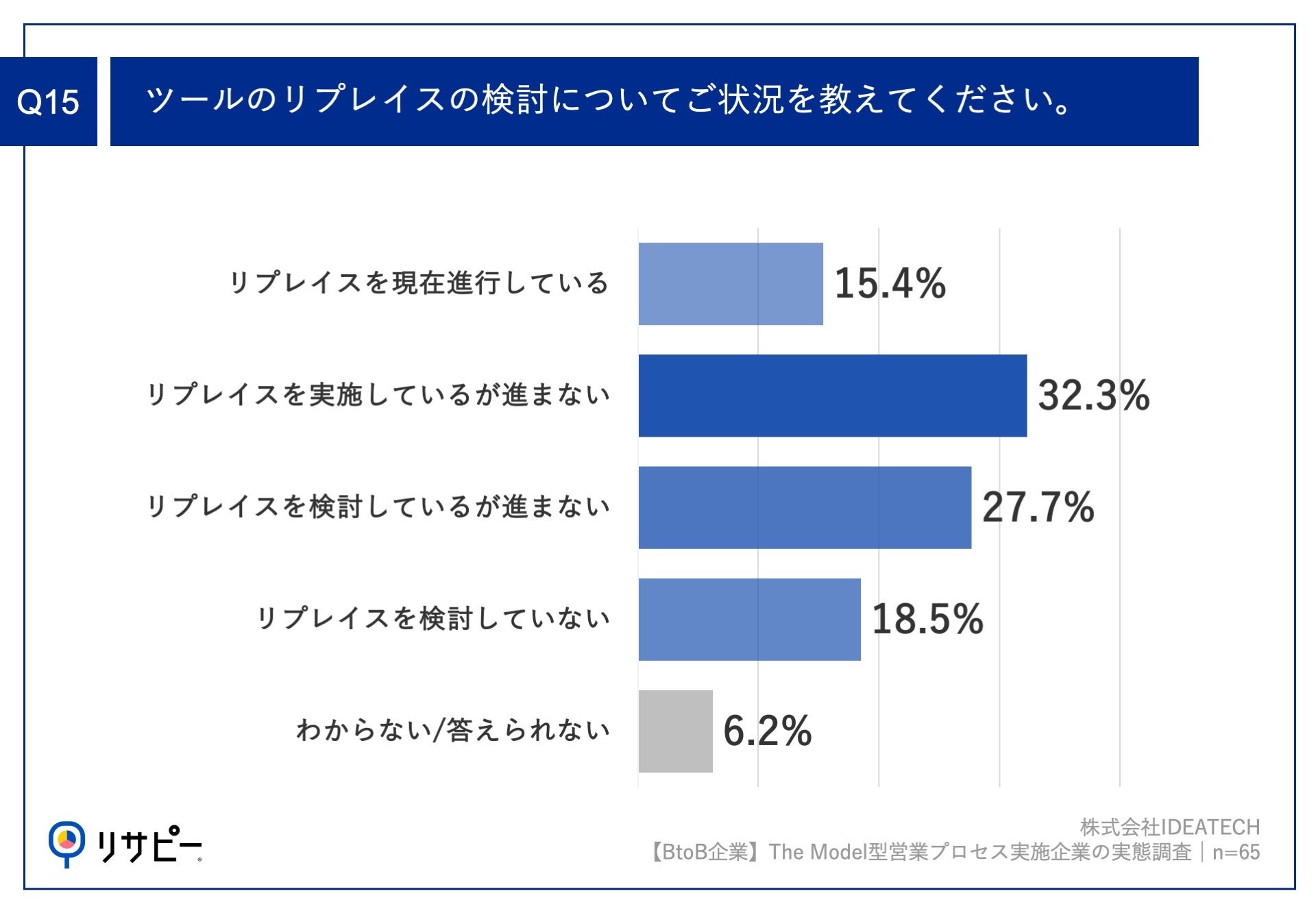 Q11で「SFAやCRMツールなどの連携・運用ができていないから」と回答した方に、「Q15.ツールのリプレイスの検討についてご状況を教えてください。」(n=65)と質問したところ、「リプレイスを実施しているが進まない」が32.3%、「リプレイスを検討しているが進まない」が27.7%、「リプレイスを検討していない」が18.5%という回答となりました。