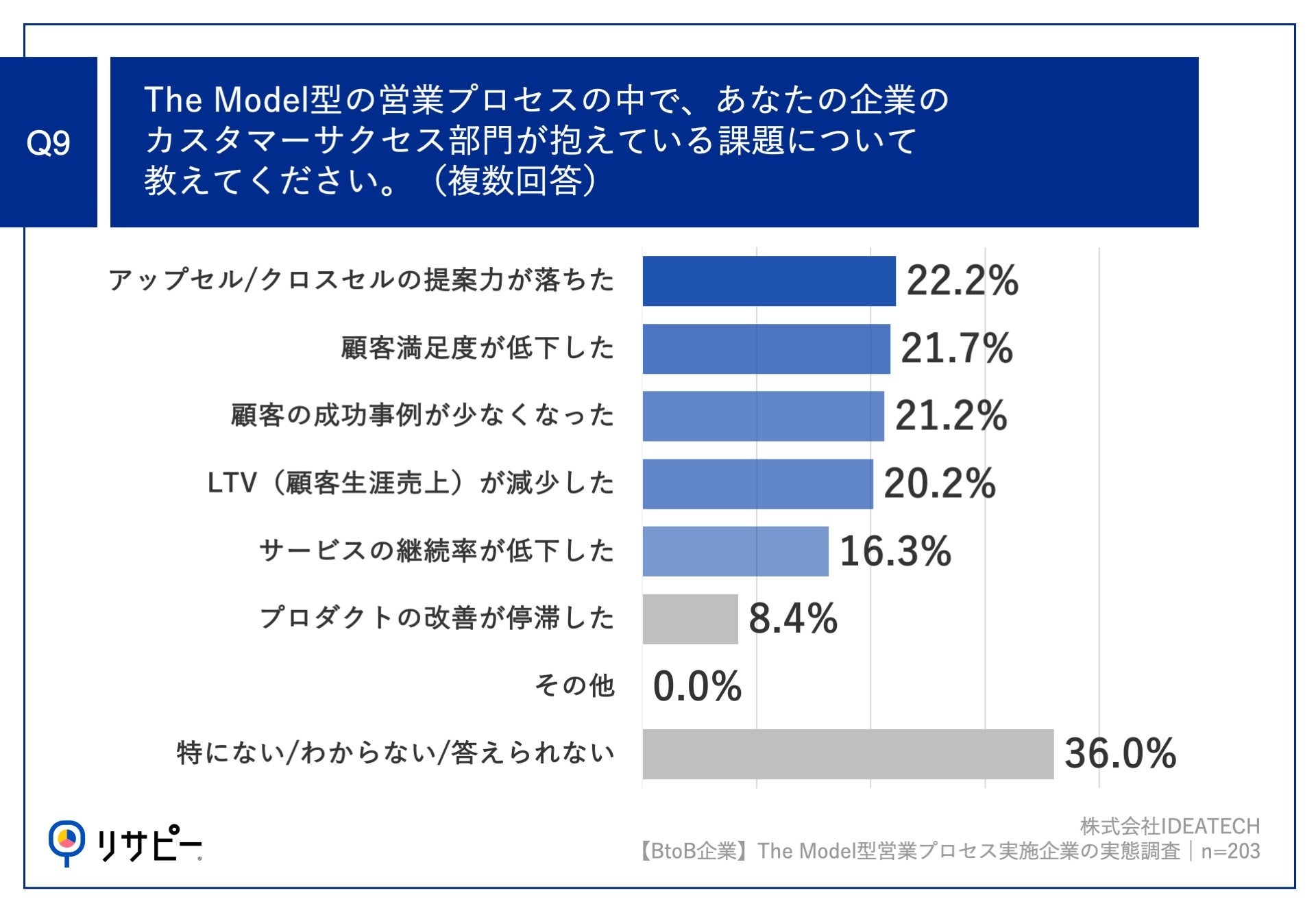 「Q9.The Model型の営業プロセスの中で、あなたの企業のカスタマーサクセス部門が抱えている課題について教えてください。(複数回答)」(n=203)と質問したところ、「アップセル/クロスセルの提案力が落ちた」が22.2%、「顧客満足度が低下した」が21.7%という回答となりました。