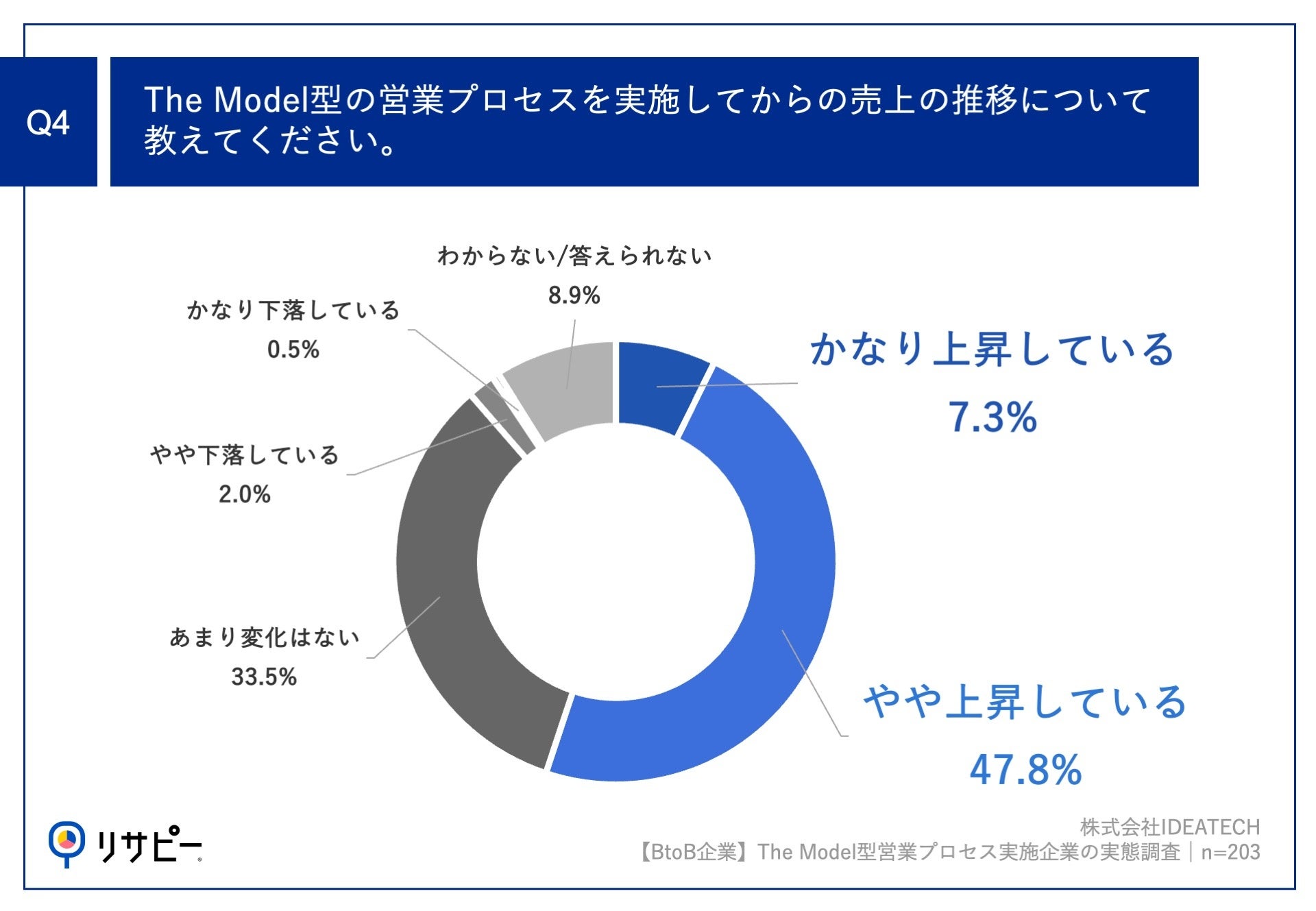 「Q4.The Model型の営業プロセスを実施してからの売上の推移について教えてください。」(n=203)と質問したところ、「やや上昇している」が47.8%、「やや上昇している」が47.8%という回答となりました。