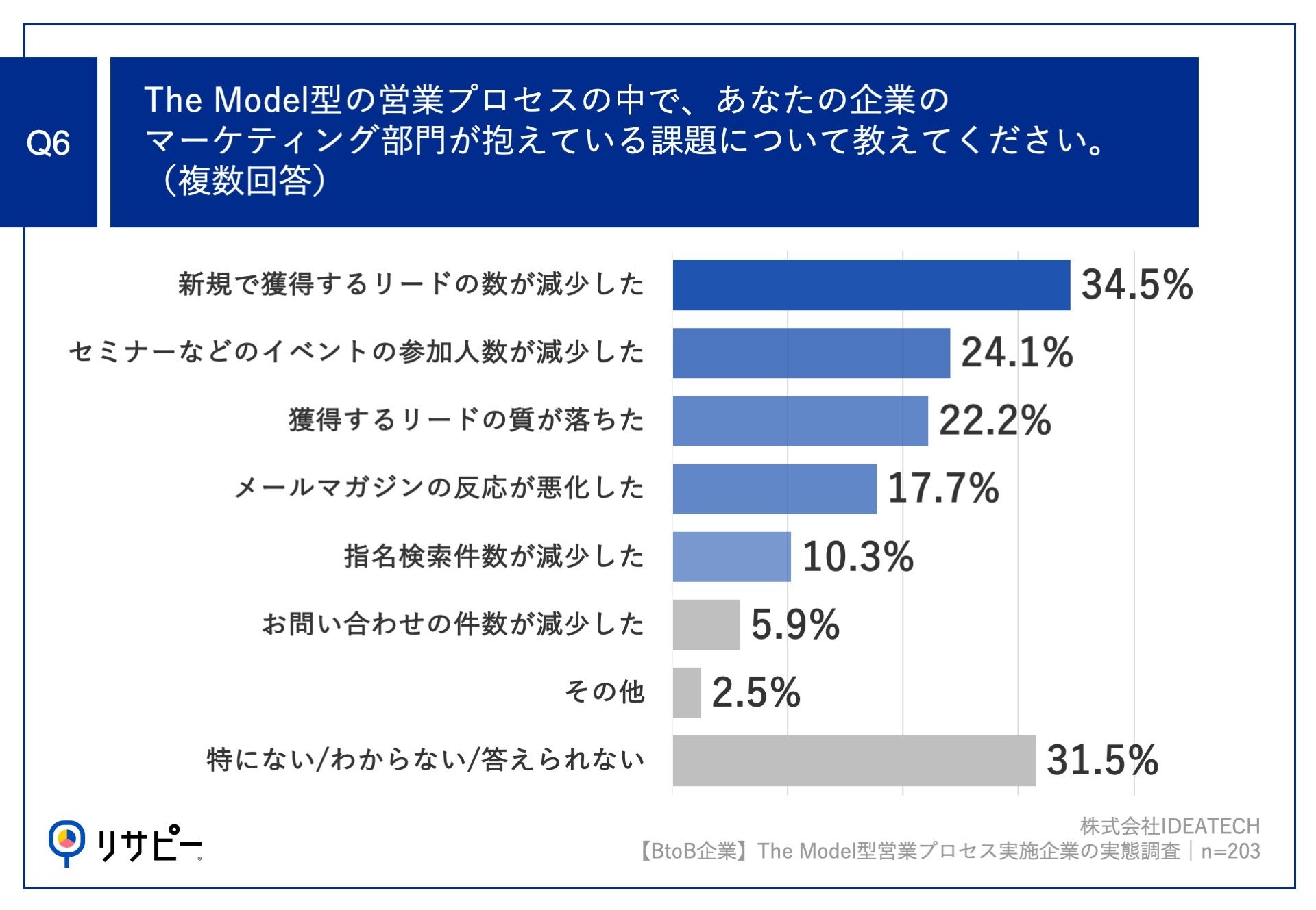 「Q6.The Model型の営業プロセスの中で、あなたの企業のマーケティング部門が抱えている課題について教えてください。(複数回答)」(n=203)と質問したところ、「新規で獲得するリードの数が減少した」が34.5%、「セミナーなどのイベントの参加人数が減少した」が24.1%という回答となりました。