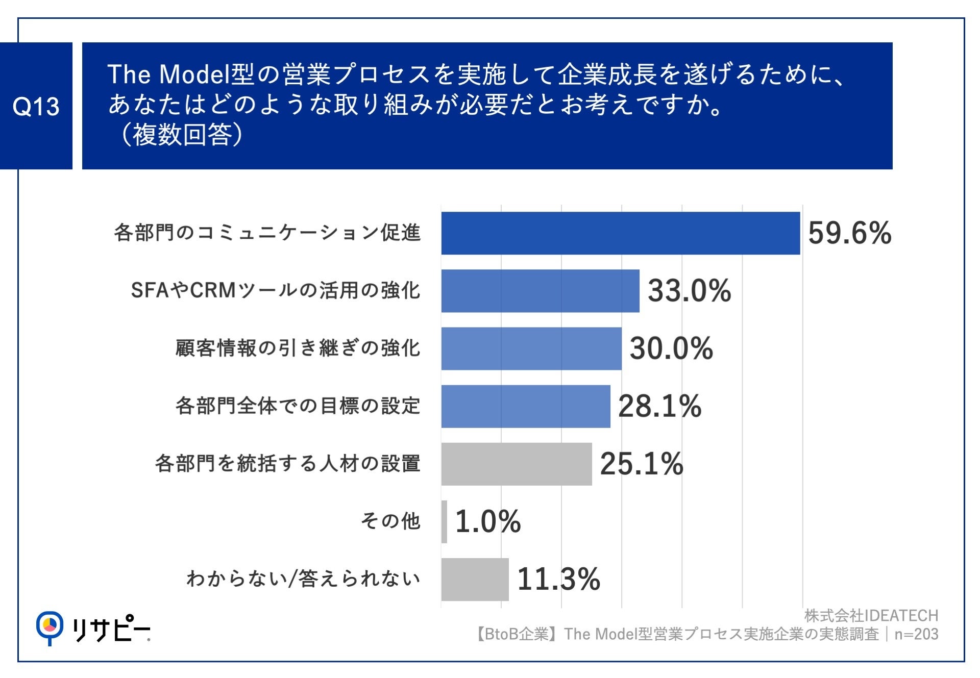 「Q13.The Model型の営業プロセスを実施して企業成長を遂げるために、あなたはどのような取り組みが必要だとお考えですか。(複数回答)」(n=203)と質問したところ、「各部門のコミュニケーション促進」が59.6%、「SFAやCRMツールの活用の強化」が33.0%、「顧客情報の引き継ぎの強化」が30.0%という回答となりました。