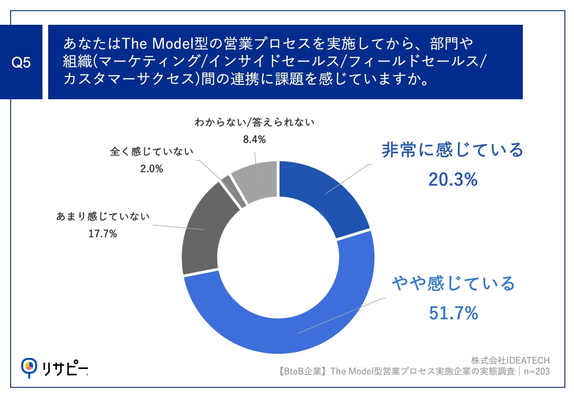 「Q5.あなたはThe Model型の営業プロセスを実施してから、部門や組織(マーケティング/インサイドセールス/フィールドセールス/カスタマーサクセス)間の連携に課題を感じていますか。」(n=203)と質問したところ、「非常に感じている」が20.3%、「やや感じている」が51.7%という回答となりました。