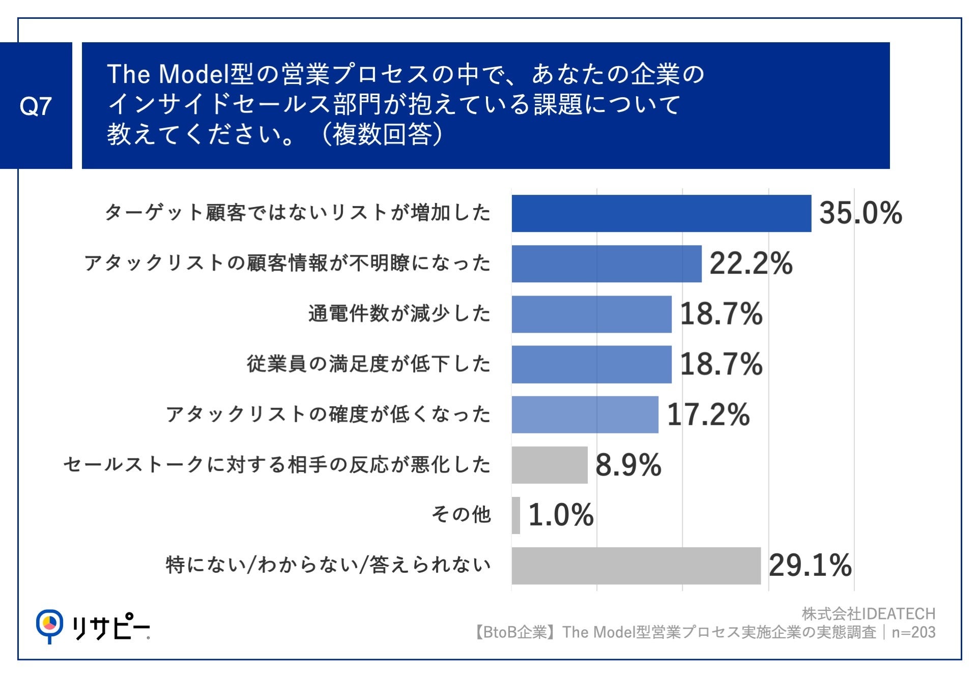 「Q7.The Model型の営業プロセスの中で、あなたの企業のインサイドセールス部門が抱えている課題について教えてください。(複数回答)」(n=203)と質問したところ、「ターゲット顧客ではないリストが増加した」が35.0%、「アタックリストの顧客情報が不明瞭になった」が22.2%という回答となりました。