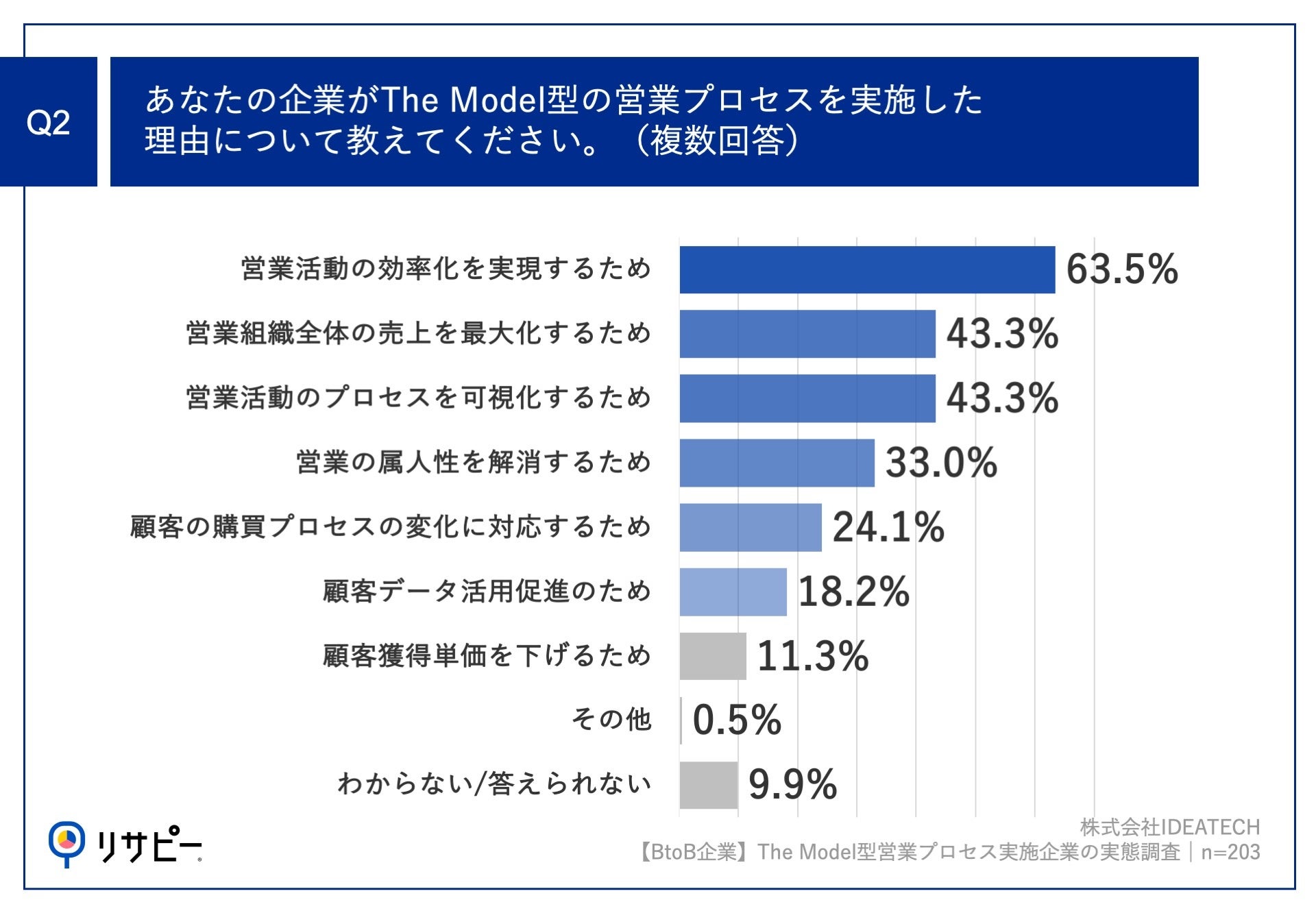 「Q2.あなたの企業がThe Model型の営業プロセスを実施した理由について教えてください。(複数回答)」(n=203)と質問したところ、「営業活動の効率化を実現するため」が63.5%、「営業組織全体の売上を最大化するため」が43.3%、「営業活動のプロセスを可視化するため」が43.3%という回答となりました。