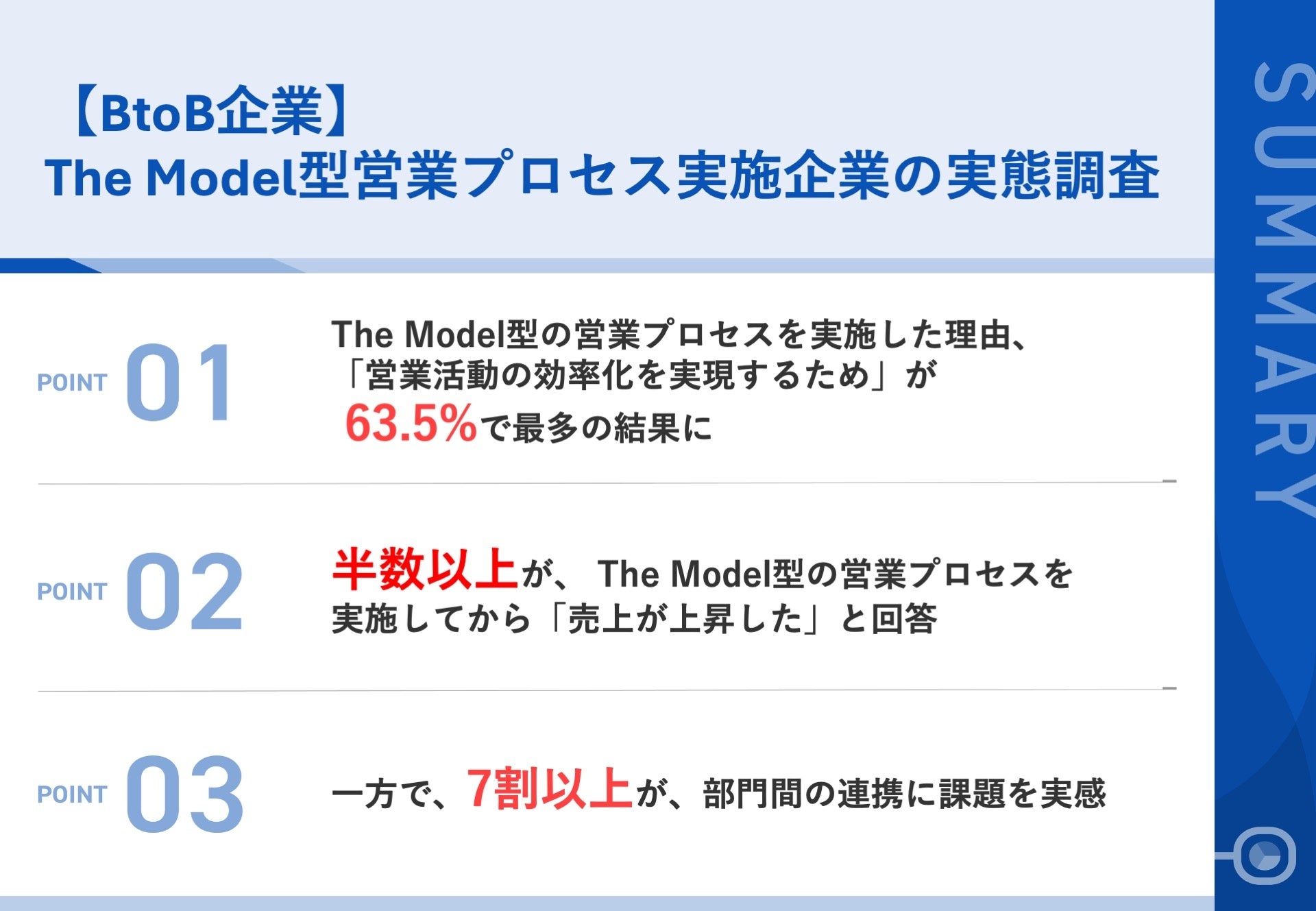 ワンストップでリサーチデータマーケティングを実現する「リサピー®️」(https://ideatech.jp/service/research-pr )を運営する株式会社IDEATECH(本社:東京都港区、代表取締役社長:石川友夫)は、The Model型の営業プロセスを実施しており、従業員300名以上のBtoB企業に所属している、営業、営業企画、マーケティング部のマネージャー、経営者203名を対象に、The Model型営業プロセス実施企業の実態調査を実施しましたので、お知らせいたします。