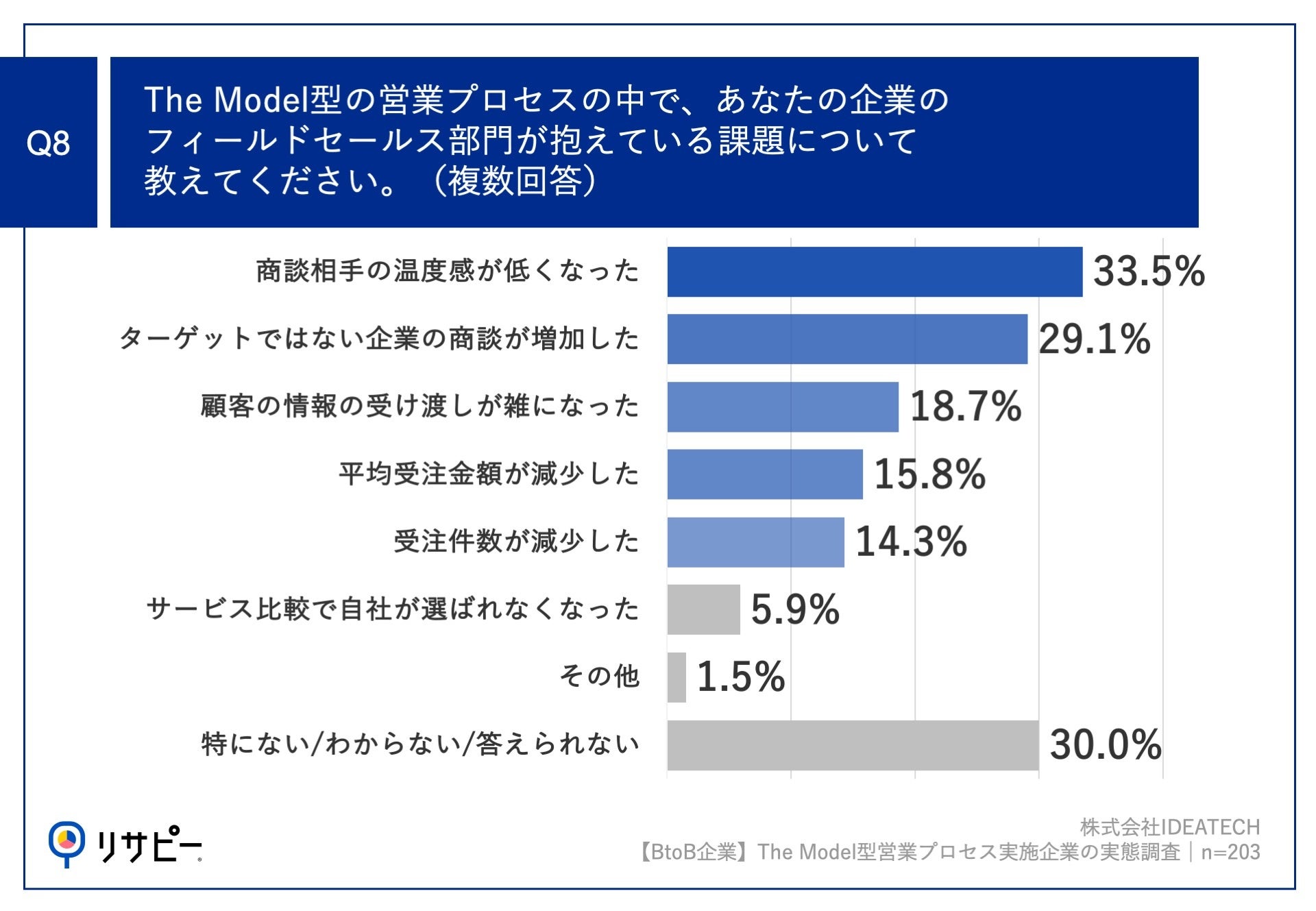 「Q8.The Model型の営業プロセスの中で、あなたの企業のフィールドセールス部門が抱えている課題について教えてください。(複数回答)」(n=203)と質問したところ、「商談相手の温度感が低くなった」が33.5%、「ターゲットではない企業の商談が増加した」が29.1%という回答となりました。
