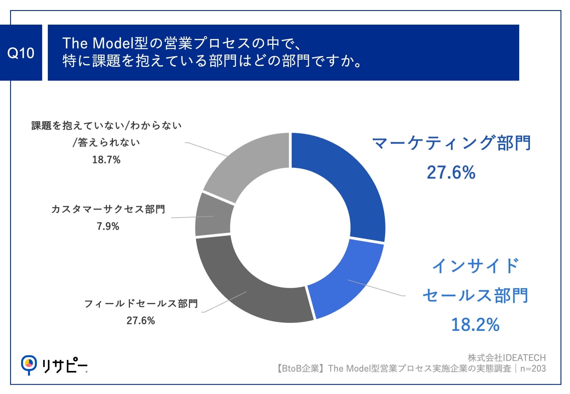 「Q10.The Model型の営業プロセスの中で、特に課題を抱えている部門はどの部門ですか。」(n=203)と質問したところ、「マーケティング部門」が27.6%、「フィールドセールス部門」が27.6%という回答となりました。