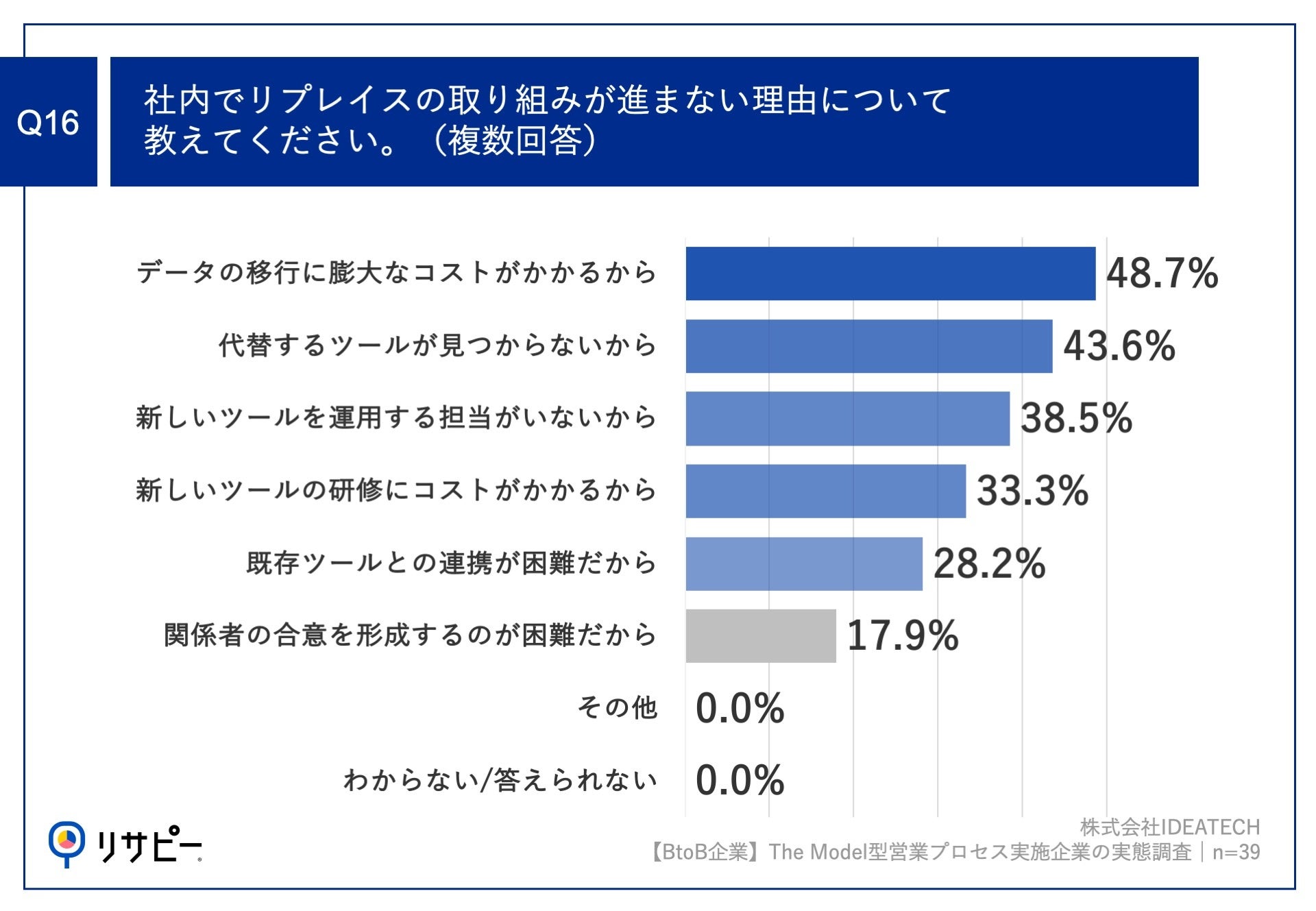 Q15で「リプレイスを実施しているが進まない」「リプレイスを検討しているが進まない」と回答した方に、「Q16.社内でリプレイスの取り組みが進まない理由について教えてください。(複数回答)」(n=39)と質問したところ、「データの移行に膨大なコストがかかるから」が48.7%、「代替するツールが見つからないから」が43.6%、「新しいツールを運用する担当がいないから」が38.5%という回答となりました。