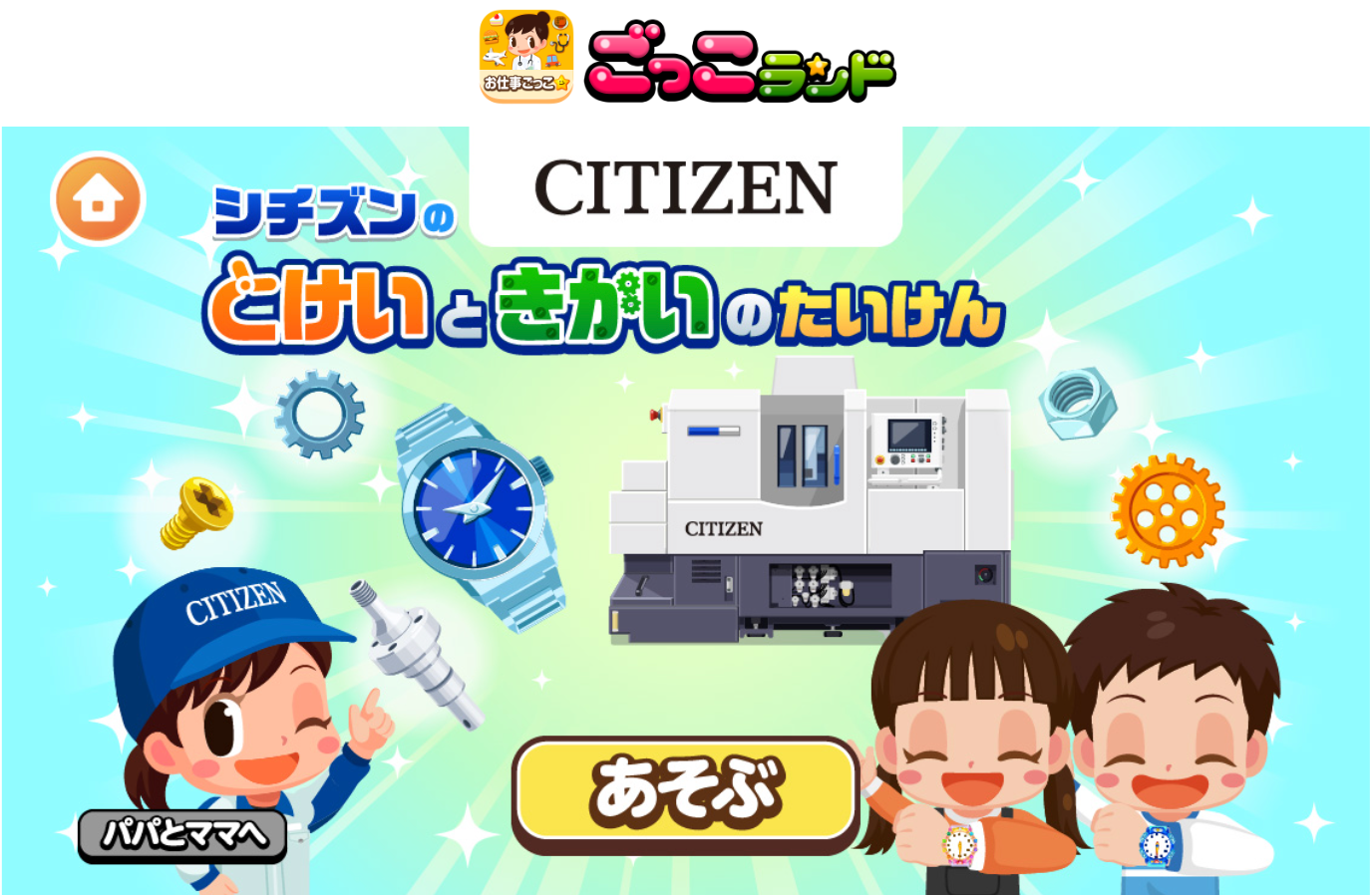 本ゲームを協賛するシチズングループは、腕時計の製造から事業をスタートし、時計事業で培った技術を工作機械や電子機器等の分野に応用し事業を展開する企業です。子どもたちが楽しみながら時計や工作機械について学び、興味・関心を持つことで、アナログ腕時計や工作機械業界をより身近に感じていただきたいという想いから、『ごっこランド』への出店が実現しました。