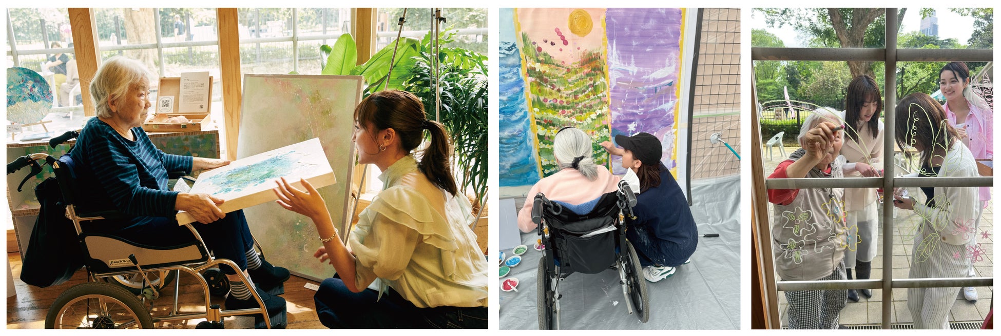 医療施設や介護施設において、入院・入居者の方々と共に創作を行う社会活動のこと。リハビリテーションの一環として、手を動かし、色を選び、表現することで、心と身体の両面に働きかける時間をつくります。アートを通じて、自己表現や他者とのつながりを生む「対話のツール」として、医療・福祉の現場にやさしく介在しています。