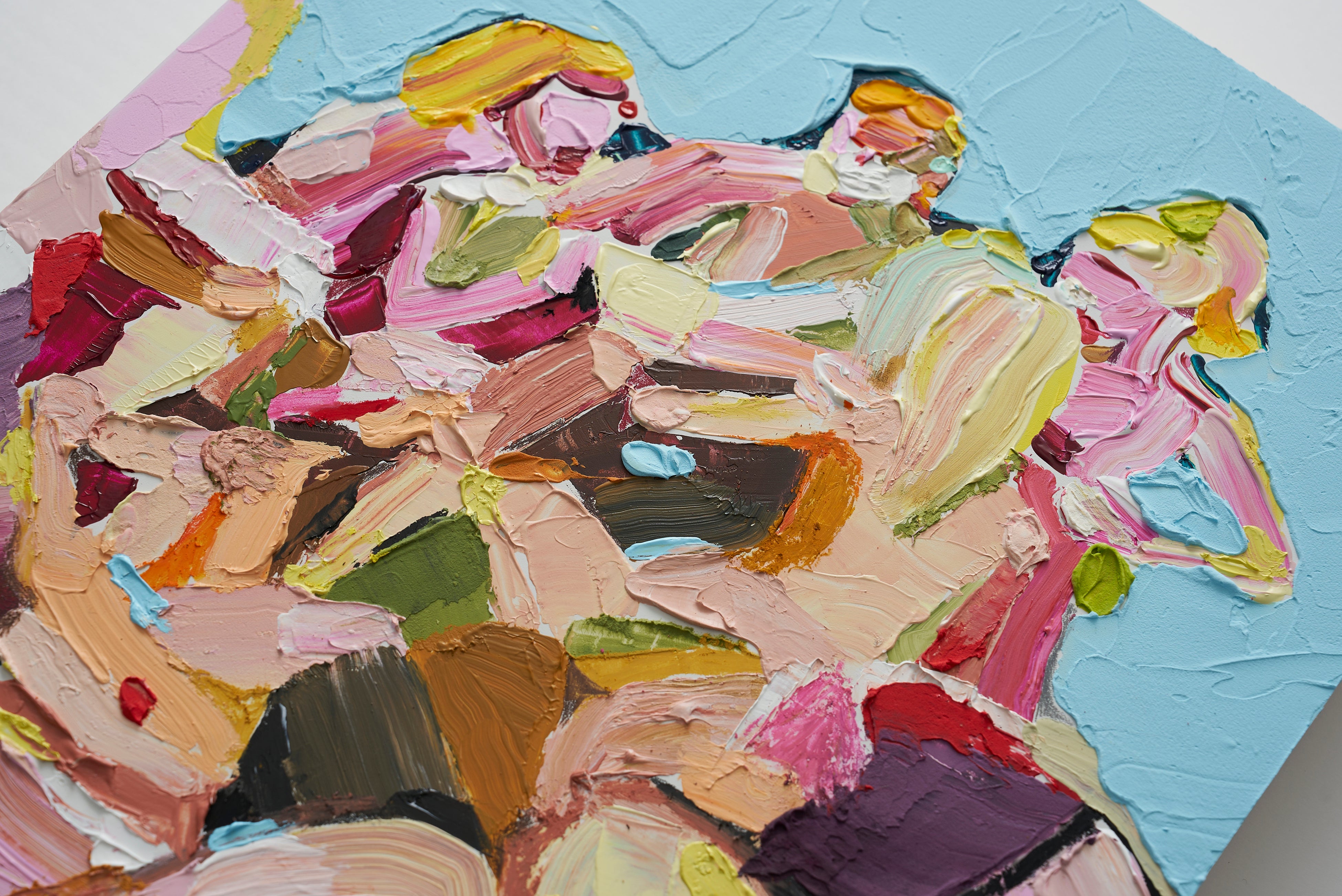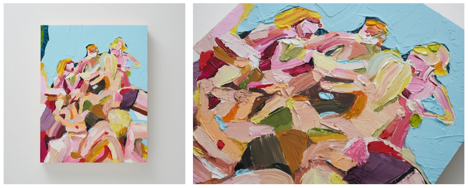 離れて見ると抽象的な色と形のリズムに包まれ、近づくと人の姿や感情が立ち上がります。