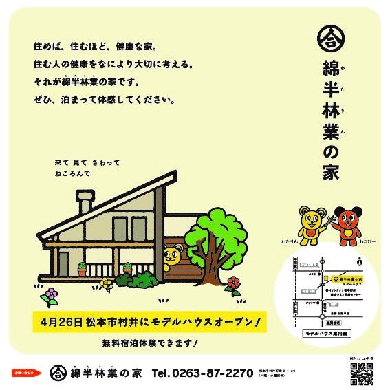 株式会社綿半林業の家(長野県飯田市 代表取締役社長:因幡善治)は、4月26日(土)、松本市村井にモデルハウスをOPEN致します。それに伴い、TVCM、ラジオ、綿半グループ各店舗に、わたりんが登場します。毎日どこかで、わたりんに会えると思います。