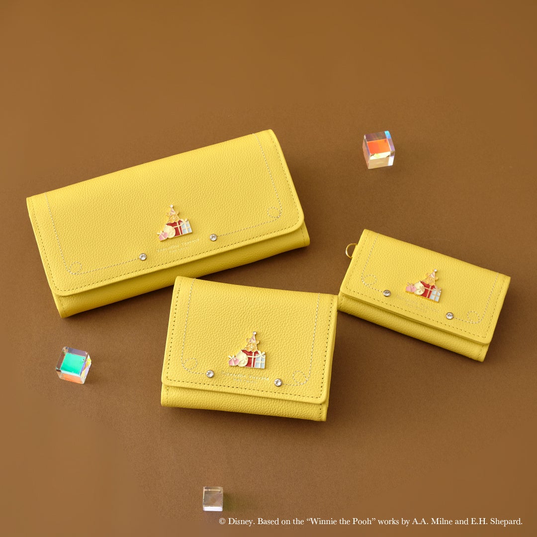 楽しそうな雰囲気が伝わる総柄アートに落ち着いたブラウンカラーを組み合わせたデザインと、「プーさん」らしいイエローカラーの革小物シリーズ。一見シンプルなデザインに、プレゼントボックスから顔を出している「プーさん」の金具とビジューがポイント。