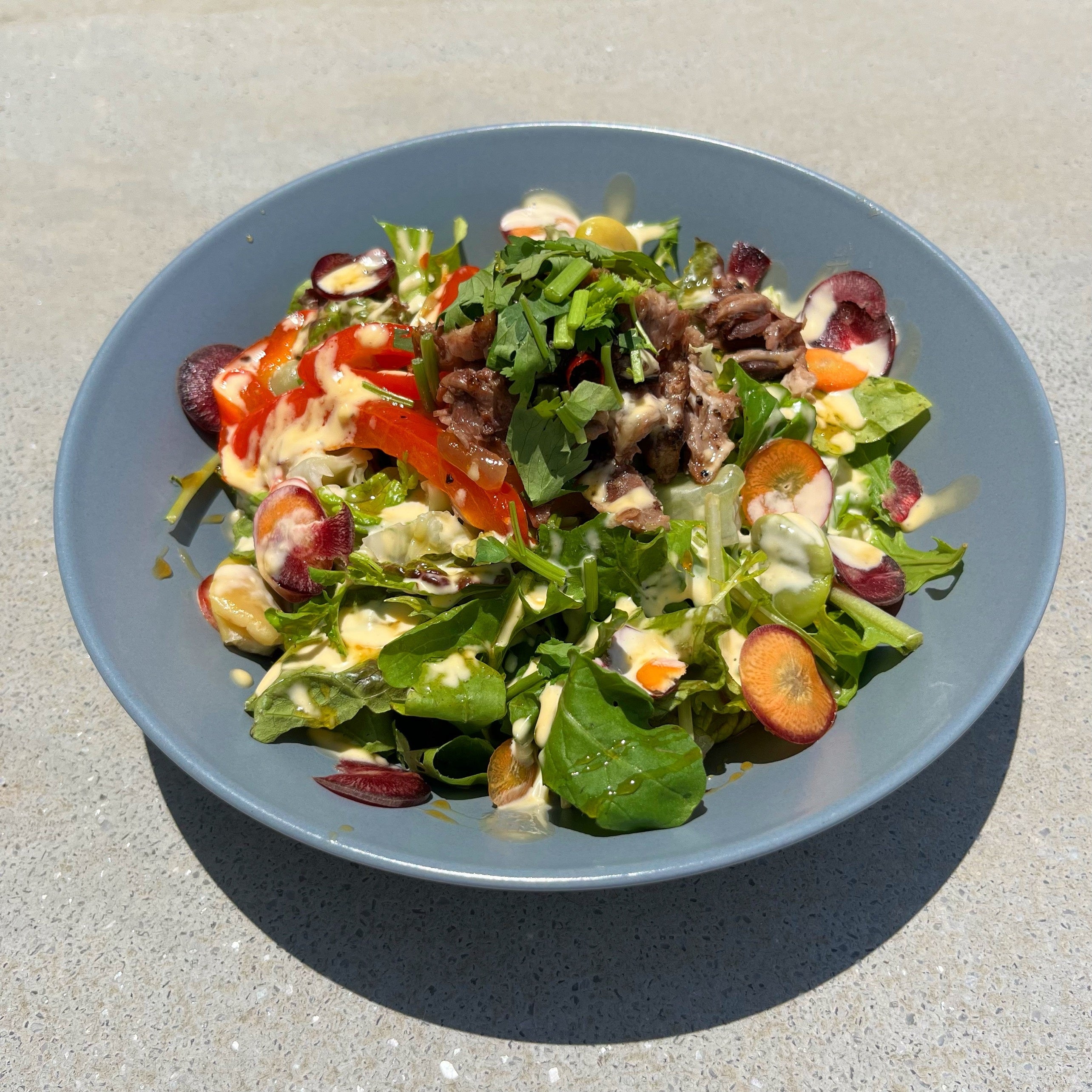 6月のサラダボウルはそら豆、水菜、ルッコラ、みさきキャベツ、人参などの新鮮なお野菜を使用したマグロのチリキャラメルサラダです。