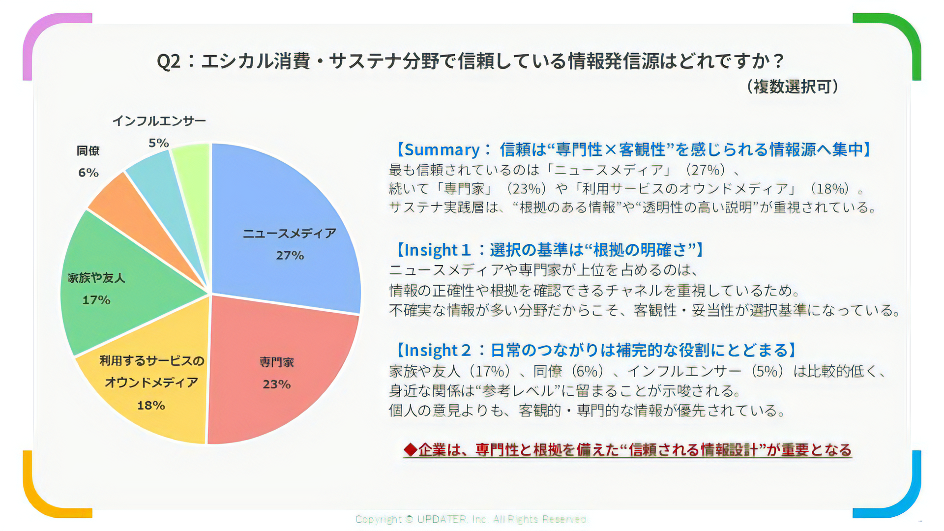 調査の結果、日常的にサステナブルな行動を続けている層の51%が「サステナブル情報に疲れや飽きを感じる」と回答しました。また、信頼できる情報源として最も支持されたのはニュース(27%)や専門家(23%)であり、SNSやインフルエンサーは参考レベルにとどまることも分かりました。