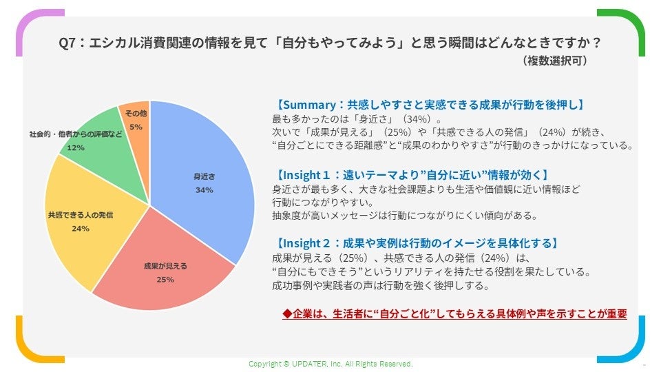 また「成果が見える」(25%)、「共感できる人の発信」(24%)も上位となり、具体的な効果や実践者の声が取り組みのイメージを作り、行動を後押しすることが分かりました。