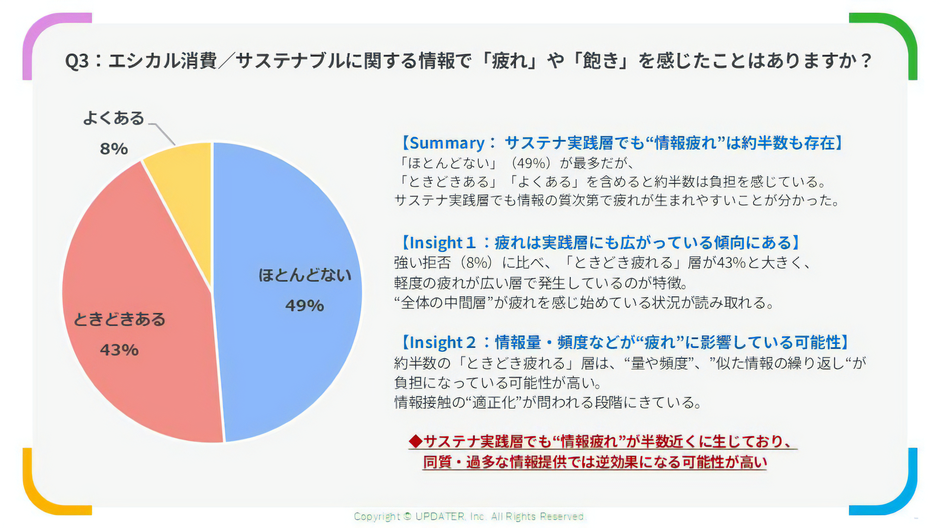 背景として、サステナ分野では同質的な情報やメッセージが多く、生活者にとって“量の多さ”や“繰り返される表現”が負担になりやすいことが考えられます。特に実践層は既に知識や関心が高いため、情報の質が伴わない場合に疲れが生じやすいことが示唆されます。