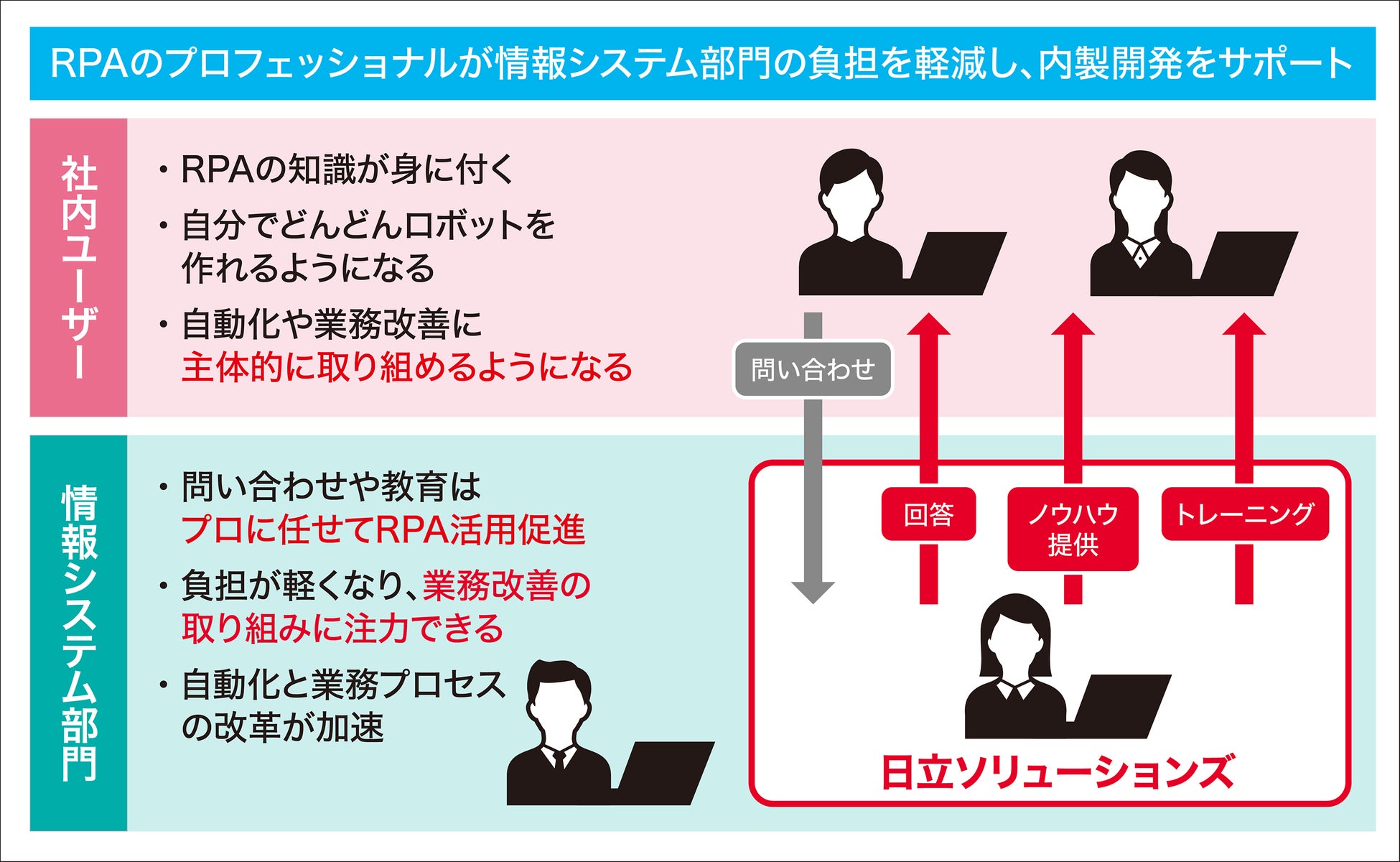 RPAによる業務の自動化が進められることになり、日立ソリューションズからの提案のもと、内製化を進めるためのトレーニングや社内からの問い合わせ対応の委託、ロボット開発の技術的なサポートなど多面的な伴走支援が得られる「RPA業務支援BPOサービス」を採用しました。