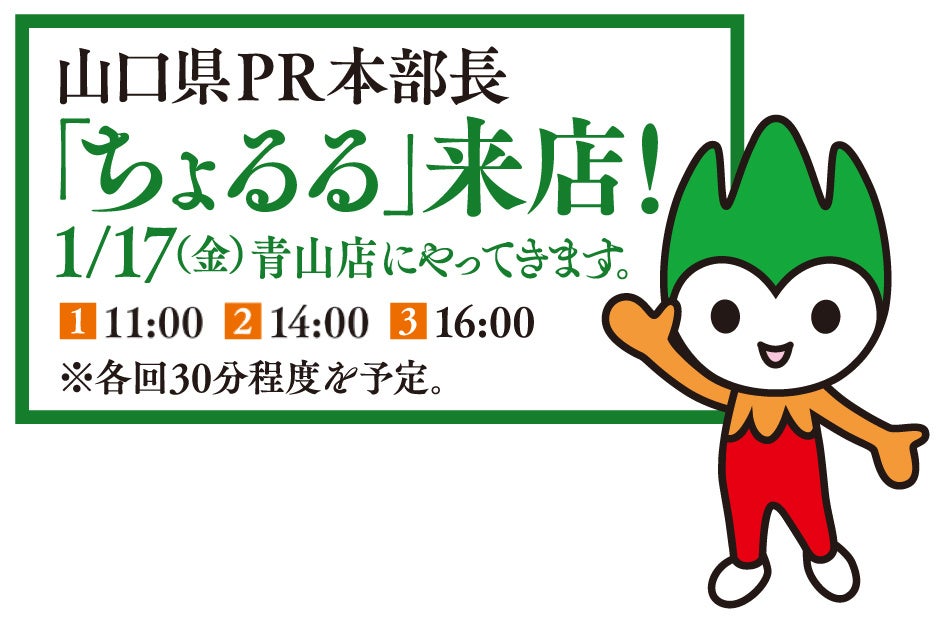 山口県の美味しい魅力を集めました。山口のマスコットキャラクター「ちょるる」がインターナショナル(青山店)に来店!