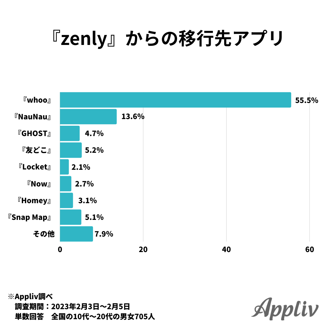 『zenly』サービス終了日(2023年2月3日)の時点で、最も多く『zenly』の代わりに利用されていたアプリは『whoo(フー)』。55.5%と他のアプリより特に高い数字です。