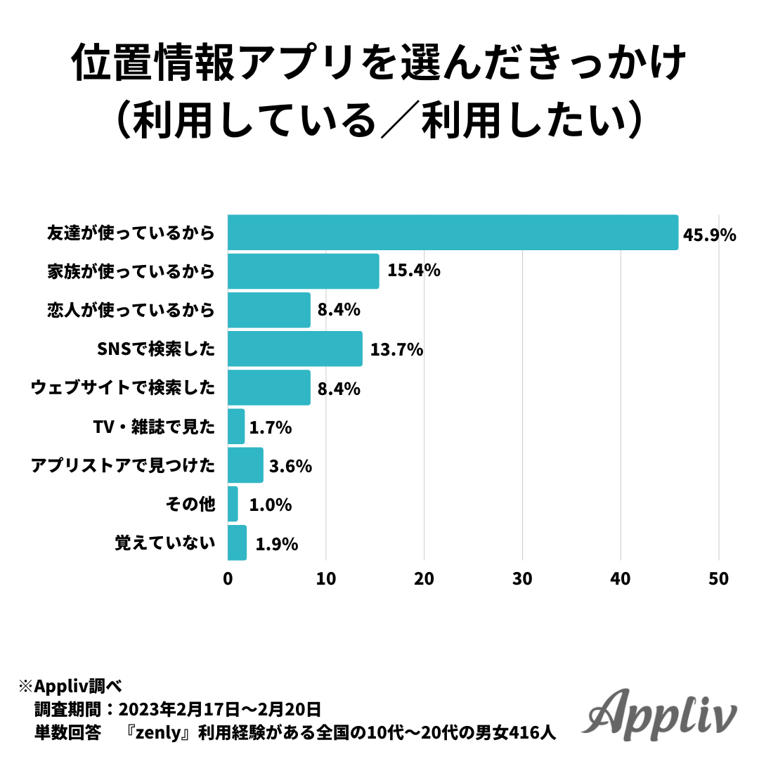 アプリ選びにあたっては、周囲に使っているユーザーがいるかどうかを基準としている人が多く見られました。同じアプリでないと位置情報の共有はできないので、まずは友達や家族など身近な位置情報アプリのユーザーを探し、その人と同じアプリを使ってみるのがいいでしょう。