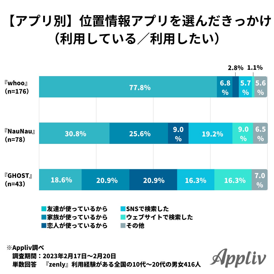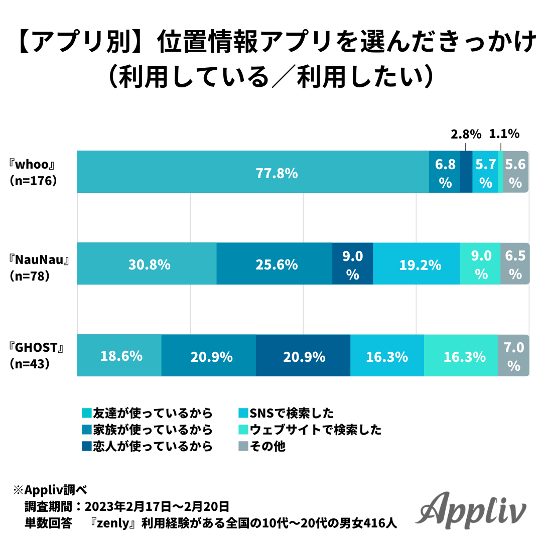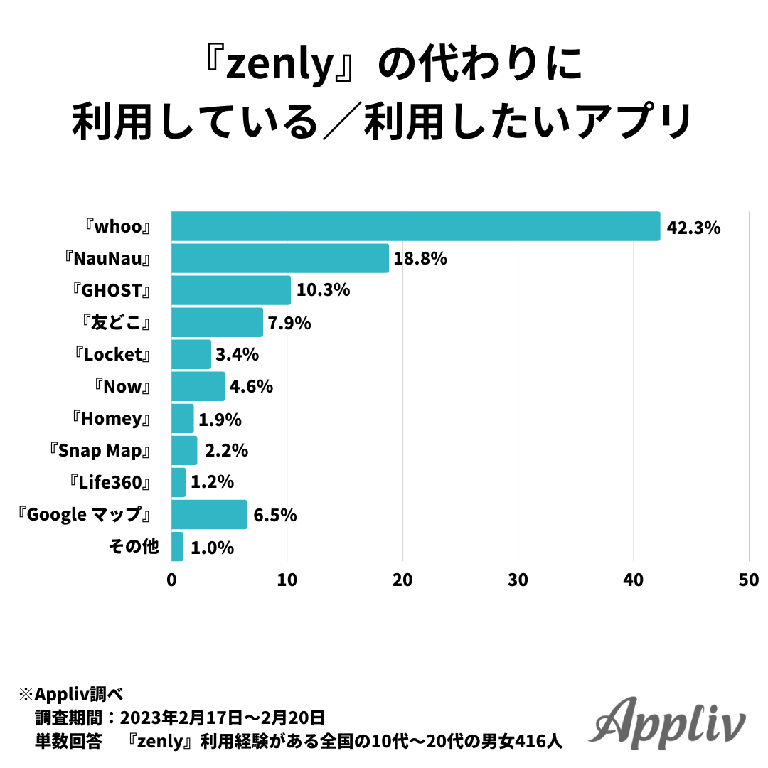 『zenly』の代替として利用している/したいアプリでは、『whoo』が42.3%で1位。次に『NauNau』が18.8%、『GHOST(ゴースト)』が10.3%と続いています。