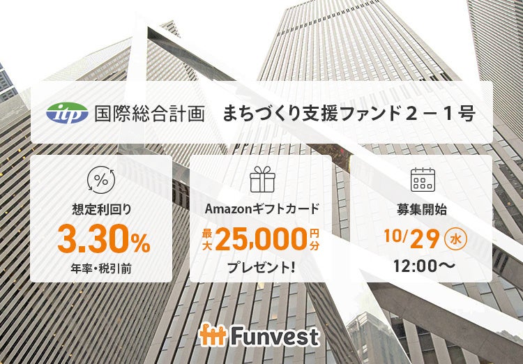 「未来をわかちあう投資」を提供する「Funvest(ファンベスト)」(以下、Funvest)は、「国際総合計画 まちづくり支援ファンド2-1号」(以下、本ファンド)の募集を10/29より開始しますので、お知らせいたします。