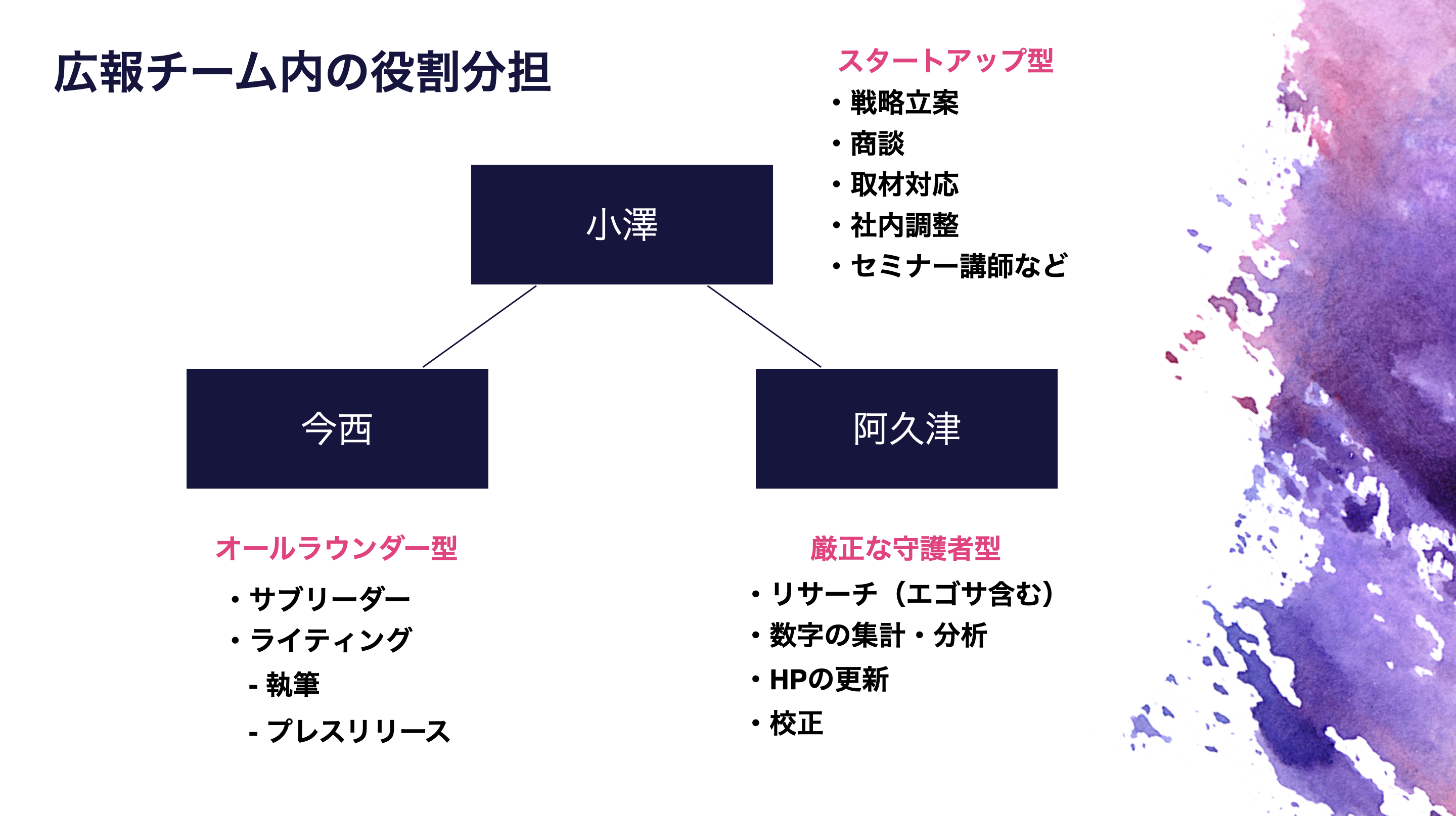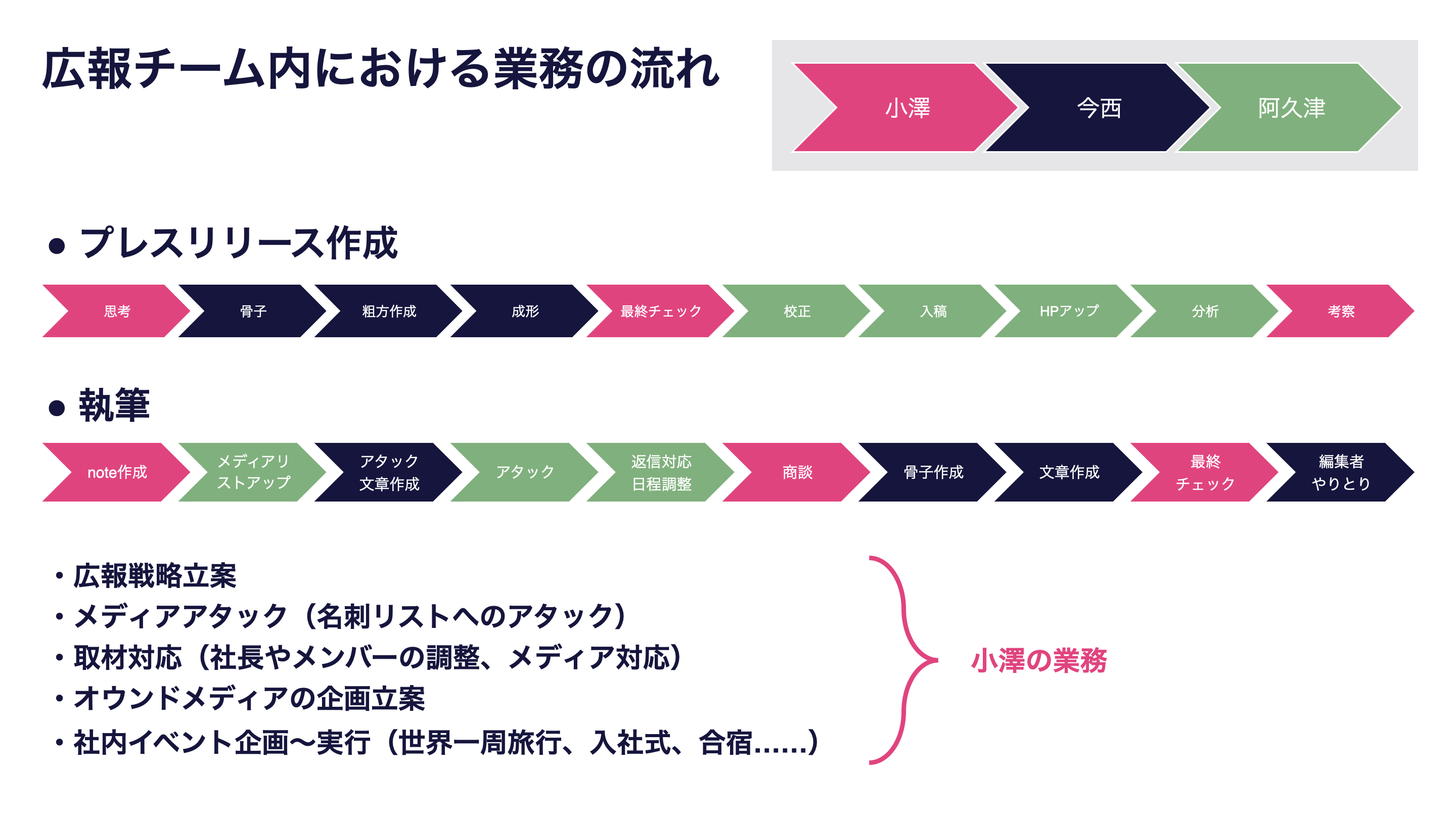 そこで、広報チームではワークシェアリングの考え方を取り入れ、誰かが急に稼働できなくなっても他のメンバーがフォローできる体制をつくっています。