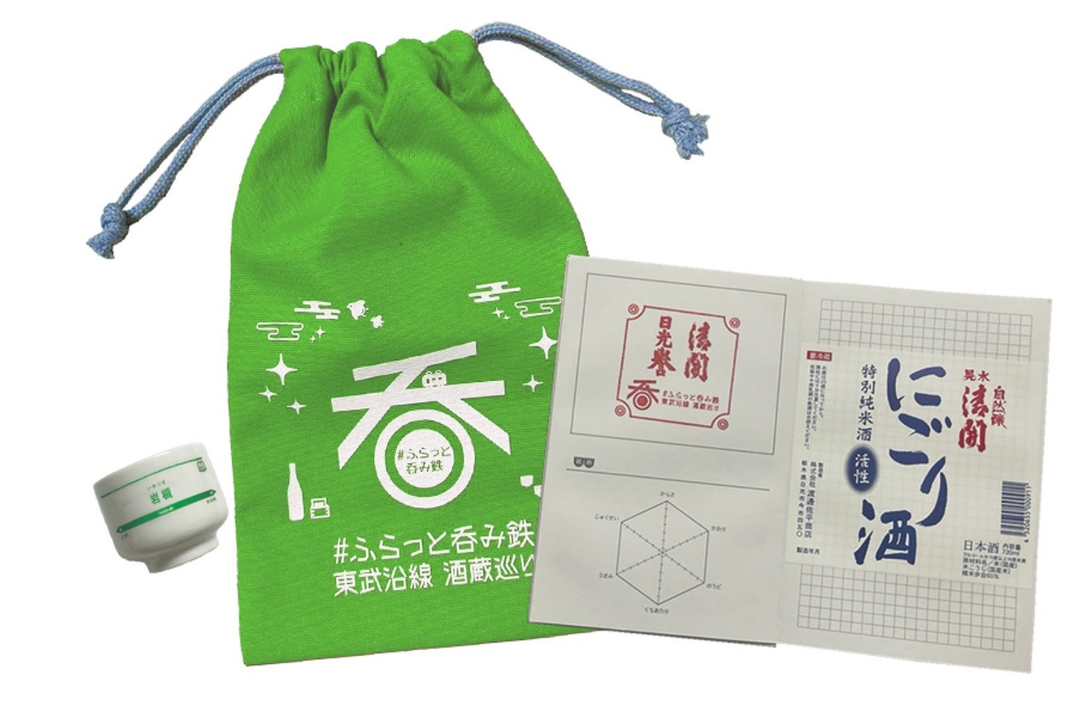 ふらっと呑み鉄のオリジナルグッズ「おちょこ」と「ふら吞み"御しゅ印"帳」と「巾着」の3点セット(税込3,300円)を本企画の参加酒蔵・飲食店で提示すると、特別なサービスを受けられます。
