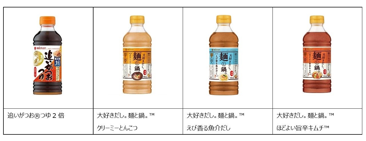 つゆはミツカンの人気商品である[追いがつお®つゆ2倍]と、【大好きだし。麺と鍋。™シリーズ】より[クリーミーとんこつ][えび香る魚介だし]