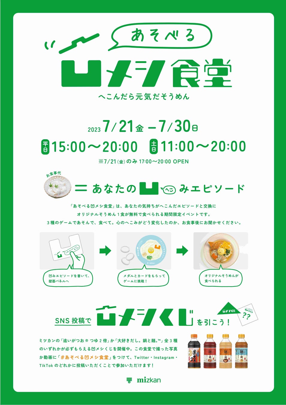 【夏のへこみは遊んで食べて吹き飛ばせ!】「あそべる凹メシ食堂」期間限定オープン~凹んだエピソードと交換でミツカンがそうめんを無料で提供~
