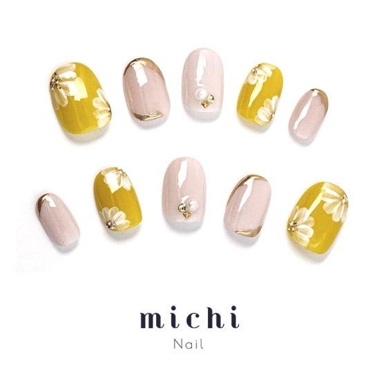 気分まで明るくなるマスタードカラーと上品なフラワーのネイル。部分的に入ったゴールドのミラーアートが華やかな印象です。旅行や結婚式などのイベントはもちろん、普段使いしやすいデザインなのが魅力です。