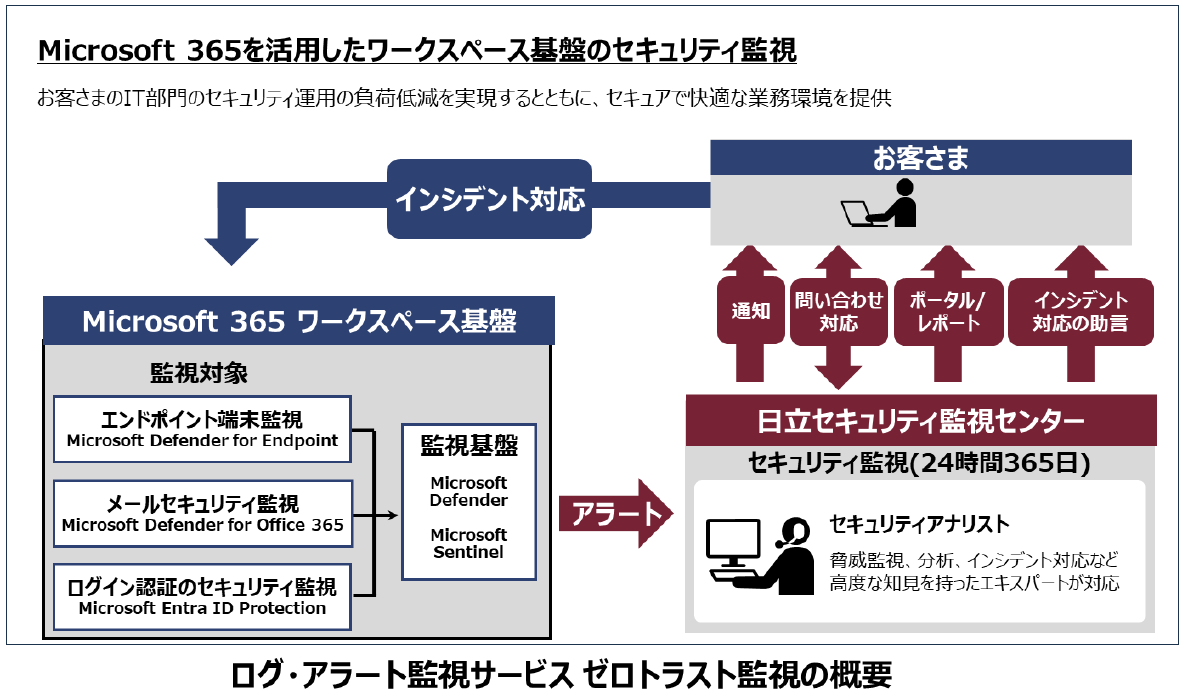 これまで日立では、お客さまの業務環境に対するサイバー攻撃の兆候や痕跡を発見するために、パブリッククラウド(アマゾン ウェブ サービス(AWS)、Microsoft Azure)及びエンドポイント端末等を監視し、攻撃観測時の迅速かつ適切な対処を支援するマネージドセキュリティサービスを提供してきました。今回、企業において導入が進むオフィスサービスMicrosoft 365環境のセキュリティ監視を統合的に実現する「ログ・アラート監視サービス ゼロトラスト監視」を新たに追加します。長年にわたる金融や公共、社会インフラおよび日立グループのセキュリティ監視の実績やノウハウを活用し、統合的かつ高品質なサービスを提供します。これにより、攻撃の対象となりやすいお客さまの基盤のセキュリティ強化を実現し、クラウド利用などにより従来の管理が行き届かなくなるIT環境において、お客さまが自社に専門人財を抱えることなく高度なセキュリティ対策が可能となります。