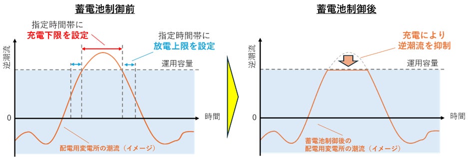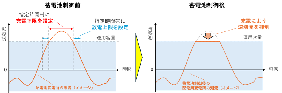 太陽光発電の発電電力量がピークを迎える日中の時間帯において、系統用蓄電池を制御することで、配電用変電所の運用容量(設備容量)を超過する太陽光発電の発電電力を充電し、系統混雑解消の実現性や課題を検証します(図2)。