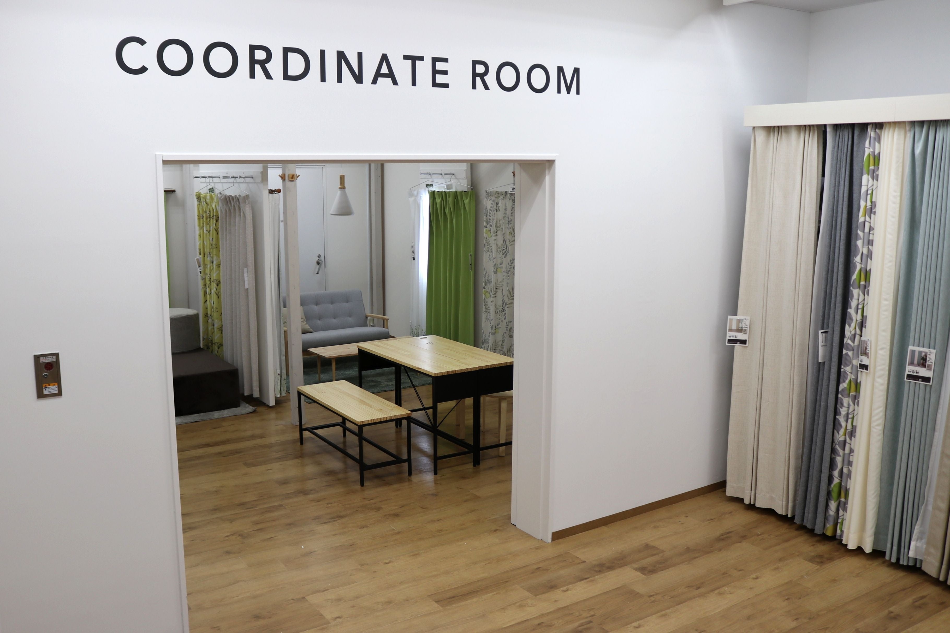 洋服をご自身のイメージやサイズに合うか試してから購入するように、カーテン売り場ではカーテンを自由に試していただくことができます。お客様のお好きな部屋や空間のイメージに合わせて、カーテンの組み合わせを楽しみながら選んでいただくための「コーディネートルーム」を常設したのに加えて、厚地とレースの組み合わせをお探しいただけるだけでなく、サンプルカーテンを自由に持ち出し、動かし、外すことができるカーテンフィッティングサービスで、お客様に最適なカーテンを選ぶことができます。