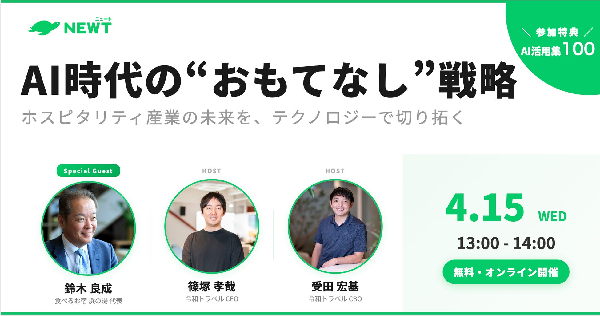 かしこい、おトク、旅行アプリ『NEWT(ニュート)』を運営する株式会社令和トラベル(本社:東京都渋谷区、代表取締役:篠塚 孝哉)は、食べるお宿 浜の湯 代表の鈴木良成氏をお招きし、「AI時代における“おもてなし”の戦略」をテーマにした無料オンラインウェビナーを2026年4月15日(水)に開催いたします。