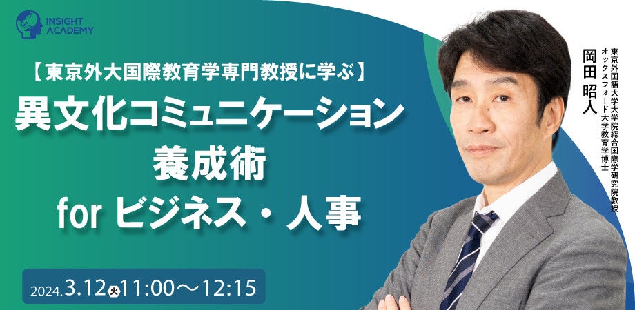 グローバル⼈材育成・研修業を⼿掛けるインサイトアカデミー株式会社(本社:東京都港区新橋、代表:金 珍燮)は、無料webセミナー「東京外大国際教育学専門教授に学ぶ 異文化コミュニケーション養成術 for ビジネス・人事」を2024年3月12日(火)11:00より開催します。
