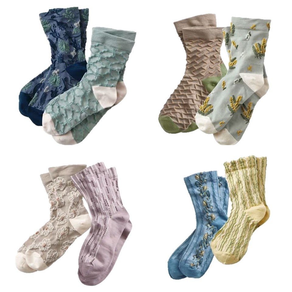ぷっくりとしたジャカード柄が可愛い、色柄違いの2足組ソックスです。シンプルながらやさしい配色で、凹凸感のある春らしいモチーフのフロート柄を引き立てます。