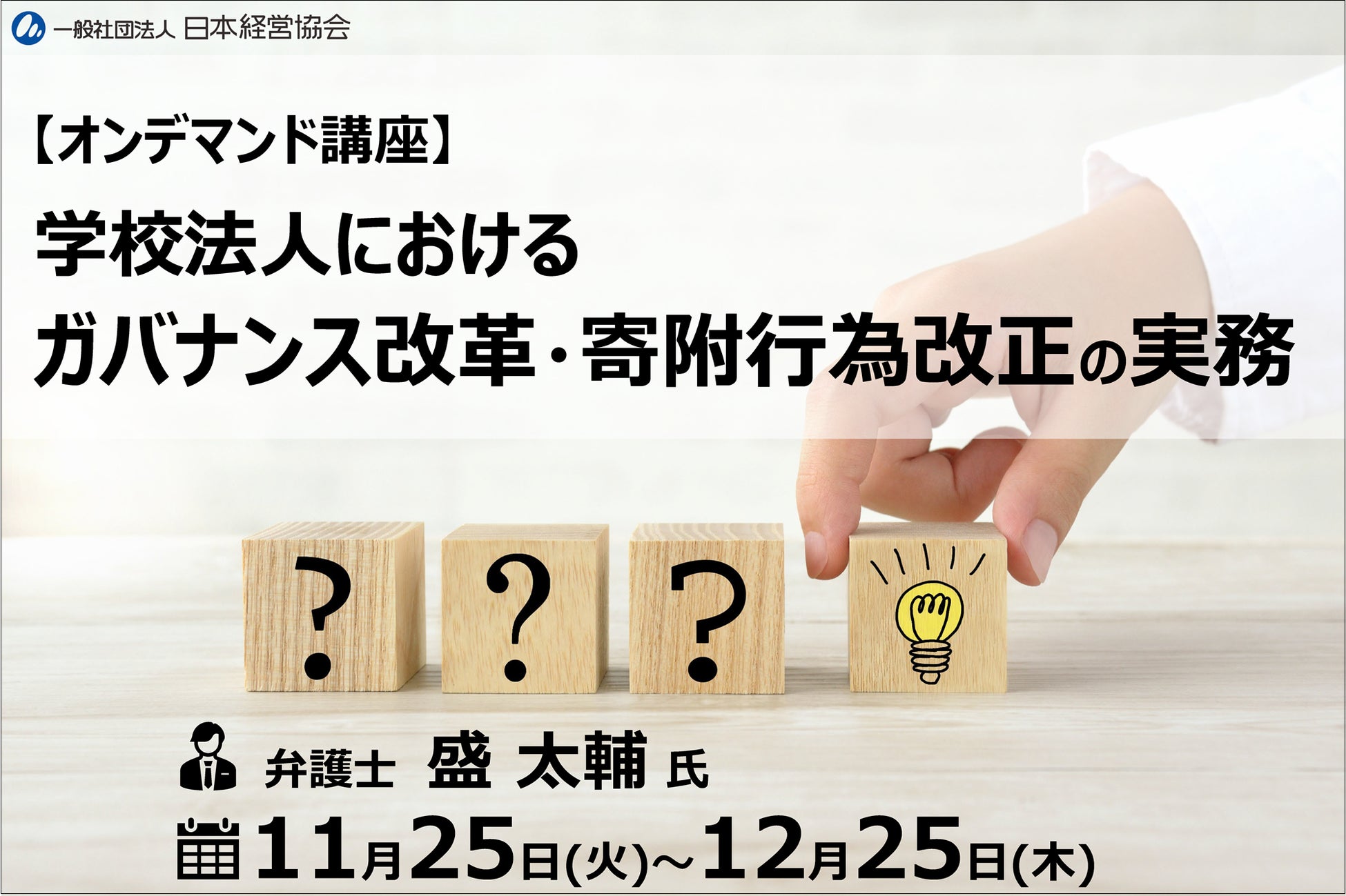 一般社団法人日本経営協会(所在地:東京都渋谷区、会長:高原 豪久)は、2025年11月25日(火)より、改正私立学校法への実務対応をテーマにした人気講座「学校法人におけるガバナンス改革・寄附行為改正の実務」をオンデマンドにて配信開始いたしました。