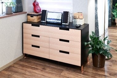 優しい風合いのナチュラルカラーとブラックのコントラストが美しい、ツートーンのチェスト。ナチュラル色と相性のよいピンクゴールドのスチール脚がアクセントです。
