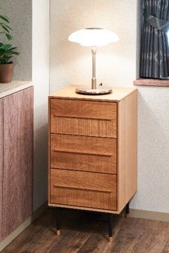 ヴィンテージを彷彿とさせる味のある風合いと、すっきりとシンプルなデザインが魅⼒のスタイリッシュなチェスト。あえて凹凸を付けるノコ目加⼯を施した前板が、天然無垢の質感をさりげなく引き⽴てます。