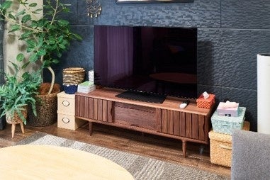 ウォールナット材をふんだんに使用した、「KISSUI(キッスイ)」シリーズのテレビボード。本体が床から浮いたすっきりとしたデザインが魅⼒です。