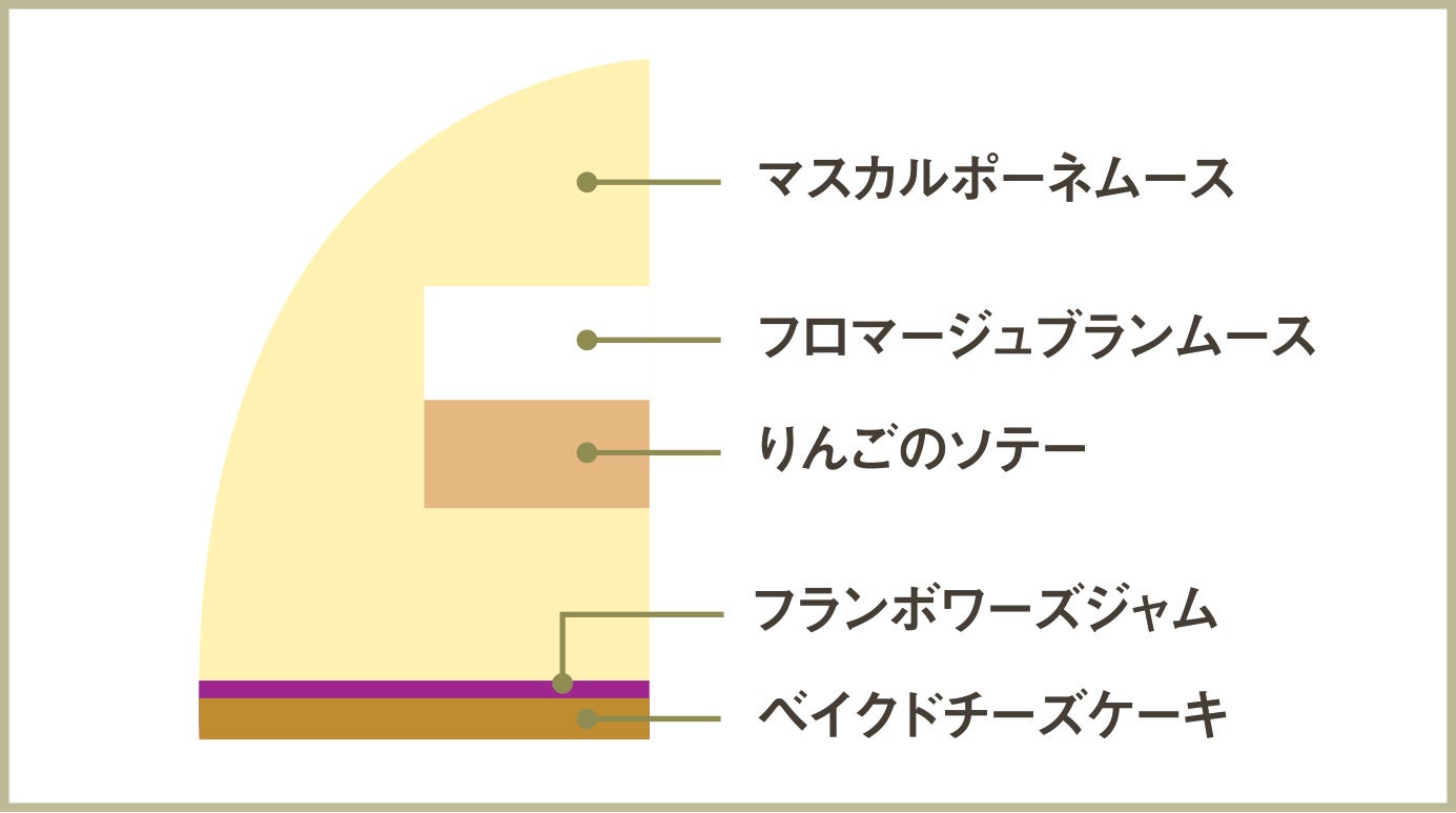 スノードームに降るふわふわな雪にソテーしたりんごの果肉の酸味とふわりと軽やかなマスカルポーネの口どけが優しく広がります。3種のチーズが織りなす奥深いコクのある味わいに仕上げました。
