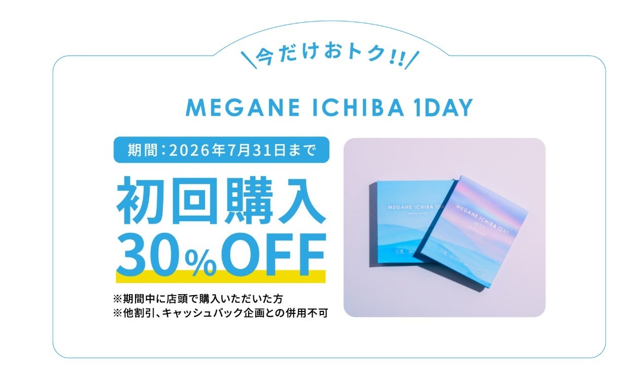 2026年7月31日までの期間中、初めて「MEGANEICHIBA 1DAY」、および「MEGANEICHIBA 1DAY MAX」を購入された方限定で、通常価格より30%OFFする特別キャンペーンを実施します。詳しくは店頭にてお問い合わせください。