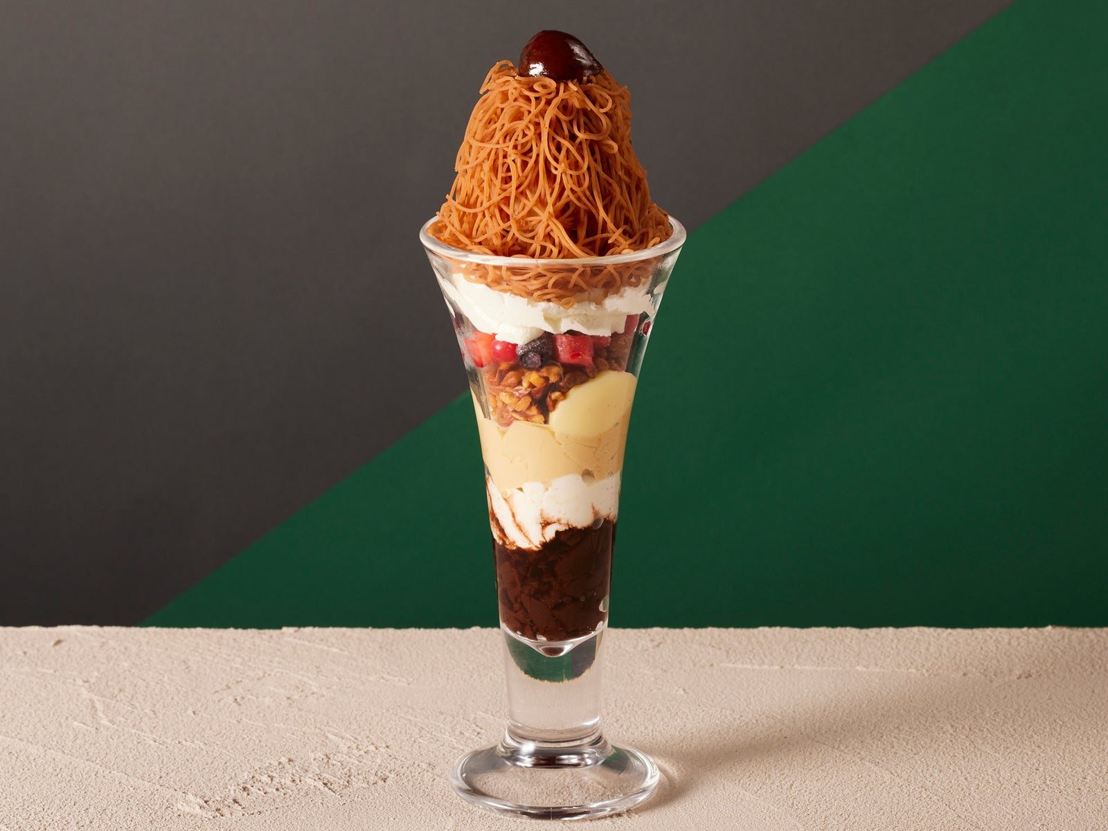 塩味と甘みが絶妙な塩キャラメルアイス、クリーミーな味わいが特長のブロンドチョコプリン、ビターな風味がアクセントになるカカオゼリーの層が、こっくりとした栗の甘みを引き立てます。